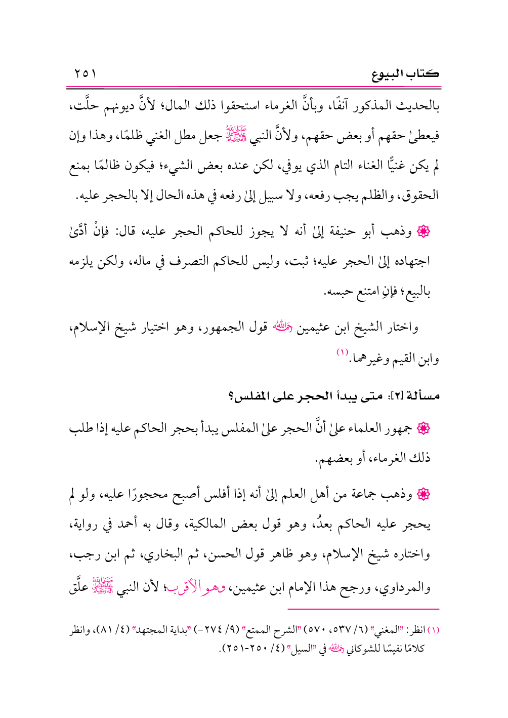 • وذهب جماعة من أهل العلم إلى أنه إذا أفلس أصبح محجورًا عليه، ولو لم يحجر عليه الحاكم بعدُ، وهو قول بعض المالكية، وقال به أحمد في رواية، واختاره شيخ الإسلام، وهو ظاهر قول الحسن، ثم البخاري، ثم ابن رجب، والمرداوي، ورجح هذا الإمام ابن عثيمين، وهو الأقرب؛ لأن النبي -صلى الله عليه وعلى آله وسلم- علَّق