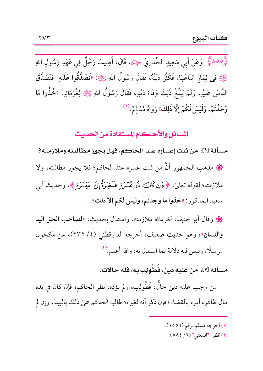 ٨٥٥ - وَعَنْ أَبِي سَعِيدٍ الخُدْرِيِّ -رضي الله عنه-، قَالَ: أُصِيبَ رَجُلٌ فِي عَهْدِ رَسُولِ اللهِ - صلى الله عليه وسلم - فِي ثِمَارٍ ابْتَاعَهَا، فَكَثُرَ دَيْنُهُ، فَقَالَ رَسُولُ اللهِ - صلى الله عليه وسلم -: «تَصَدَّقُوا عَلَيْهِ» فَتَصَدَّقَ النَّاسُ عَلَيْهِ، وَلَمْ يَبْلُغْ ذَلِكَ وَفَاءَ دَيْنِهِ، فَقَالَ رَسُولُ اللهِ - صلى الله عليه وسلم - لِغُرَمَائِهِ: «خُذُوا مَا وَجَدْتُمْ، وَلَيْسَ لَكُمْ إلَّا ذَلِكَ» رَوَاهُ مُسْلِمٌ. (¬١)