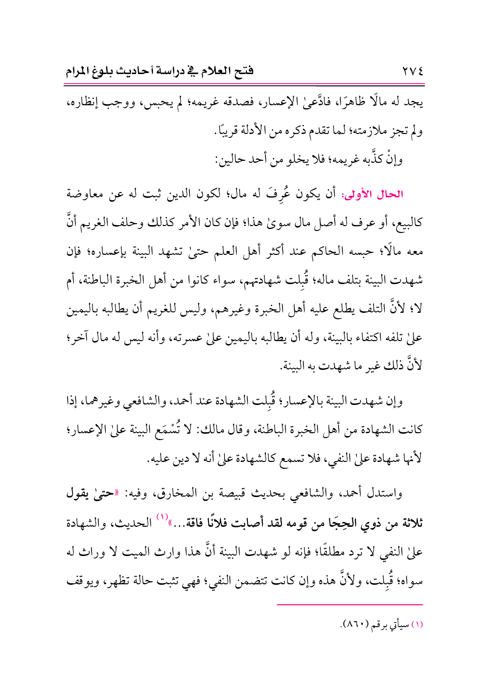 واستدل أحمد، والشافعي بحديث قبيصة بن المخارق، وفيه: «حتى يقول ثلاثة من ذوي الحِجَا من قومه لقد أصابت فلانًا فاقة ... » (¬١) الحديث، والشهادة على النفي لا ترد مطلقًا؛ فإنه لو شهدت البينة أنَّ هذا وارث الميت لا وراث له سواه؛ قُبِلت، ولأنَّ هذه وإن كانت تتضمن النفي؛ فهي تثبت حالة تظهر، ويوقف