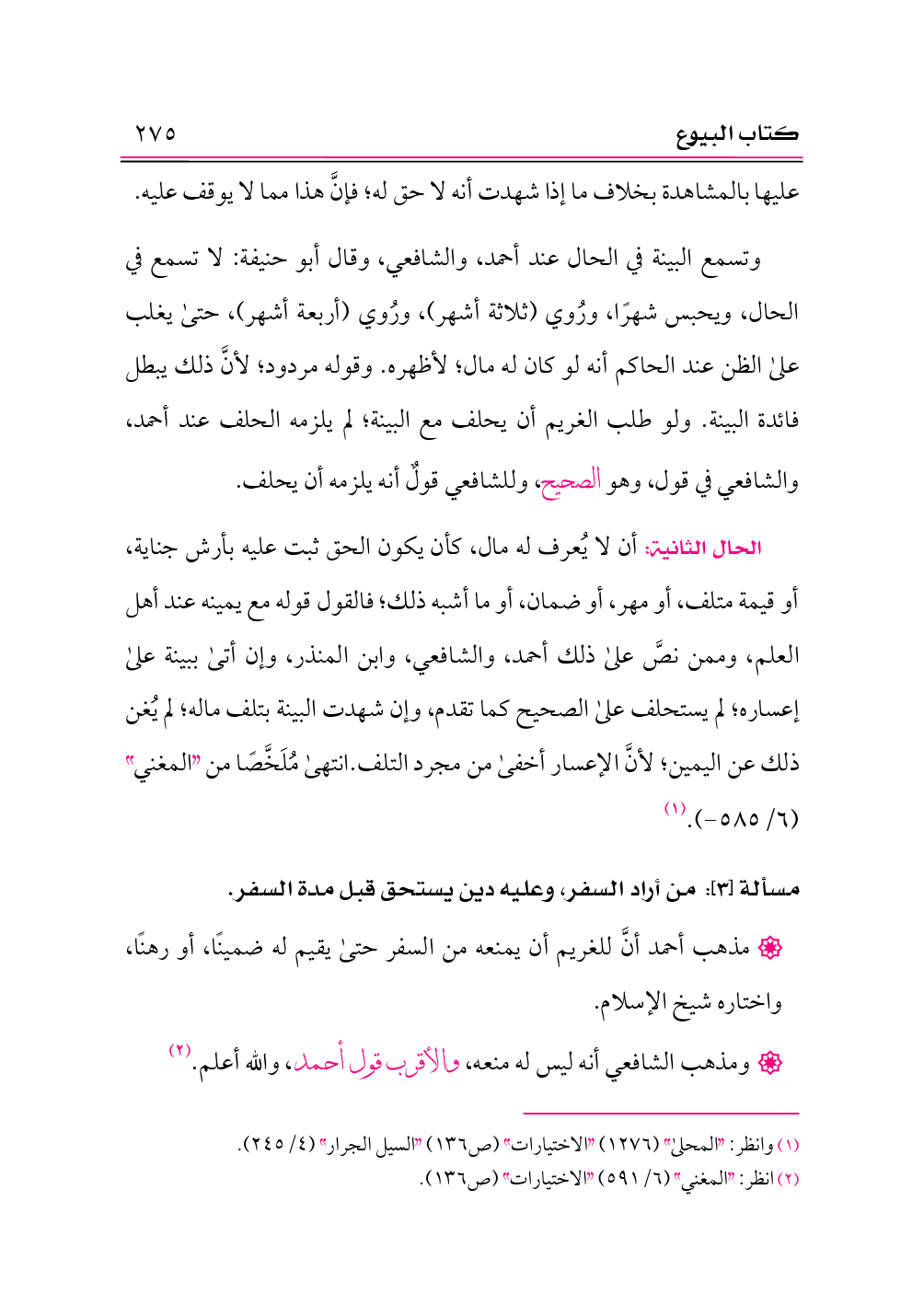 • مذهب أحمد أنَّ للغريم أن يمنعه من السفر حتى يقيم له ضمينًا، أو رهنًا، واختاره شيخ الإسلام.
