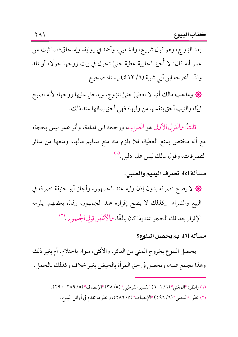قلتُ: والقول الأول هو الصواب، ورجحه ابن قدامة، وأثر عمر ليس بحجة؛ مع أنه مختص بمنع العطية، فلا يلزم منه منع تسليم مالها، ومنعها من سائر التصرفات، وقول مالك ليس عليه دليل. (¬١)