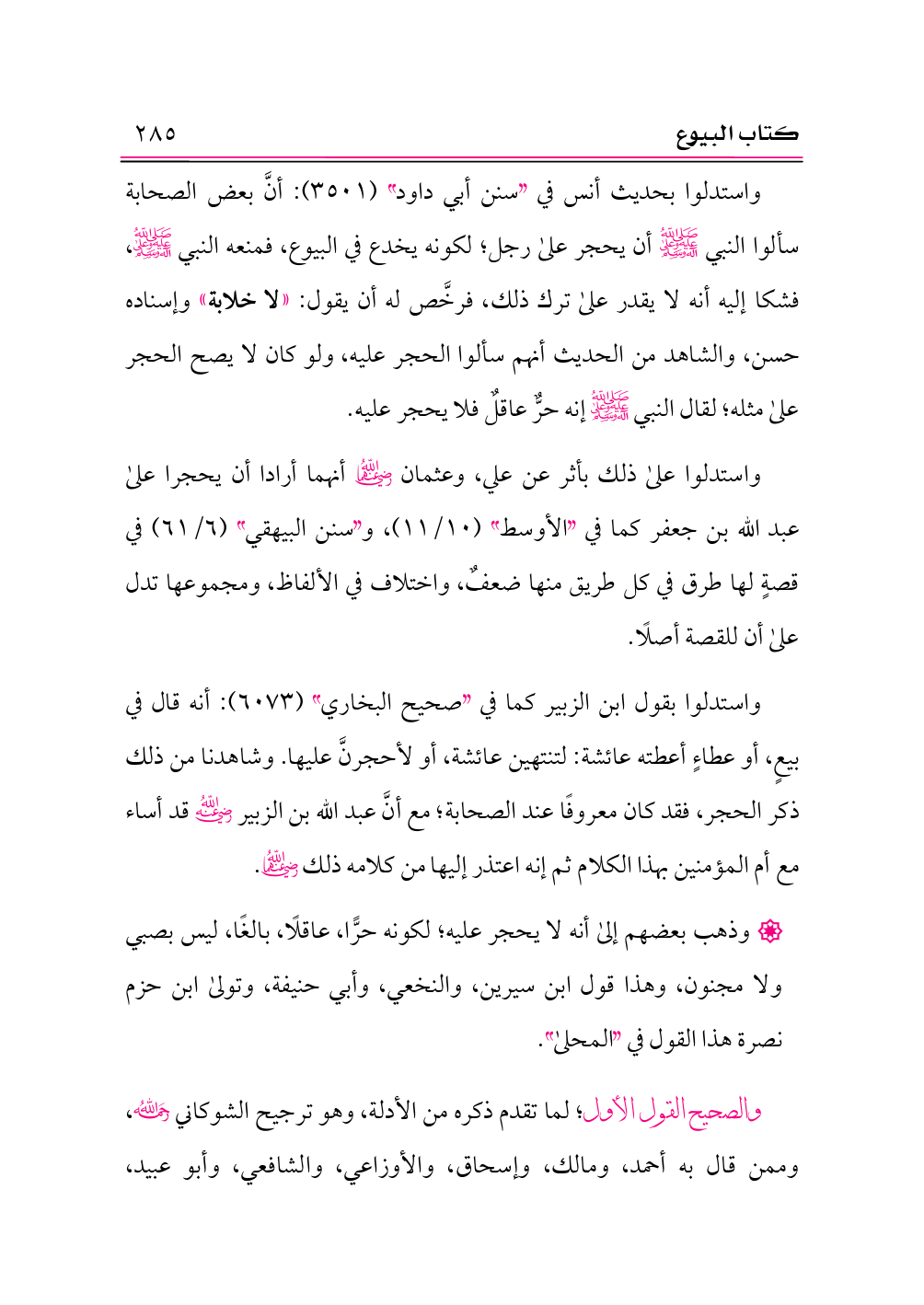 واستدلوا بحديث أنس في «سنن أبي داود» (٣٥٠١): أنَّ بعض الصحابة سألوا النبي -صلى الله عليه وعلى آله وسلم- أن يحجر على رجل؛ لكونه يخدع في البيوع، فمنعه النبي -صلى الله عليه وعلى آله وسلم-، فشكا إليه أنه لا يقدر على ترك ذلك، فرخَّص له أن يقول: «لا خلابة» وإسناده حسن، والشاهد من الحديث أنهم سألوا الحجر عليه، ولو كان لا يصح الحجر على مثله؛ لقال النبي -صلى الله عليه وعلى آله وسلم- إنه حرٌّ عاقلٌ فلا يحجر عليه.