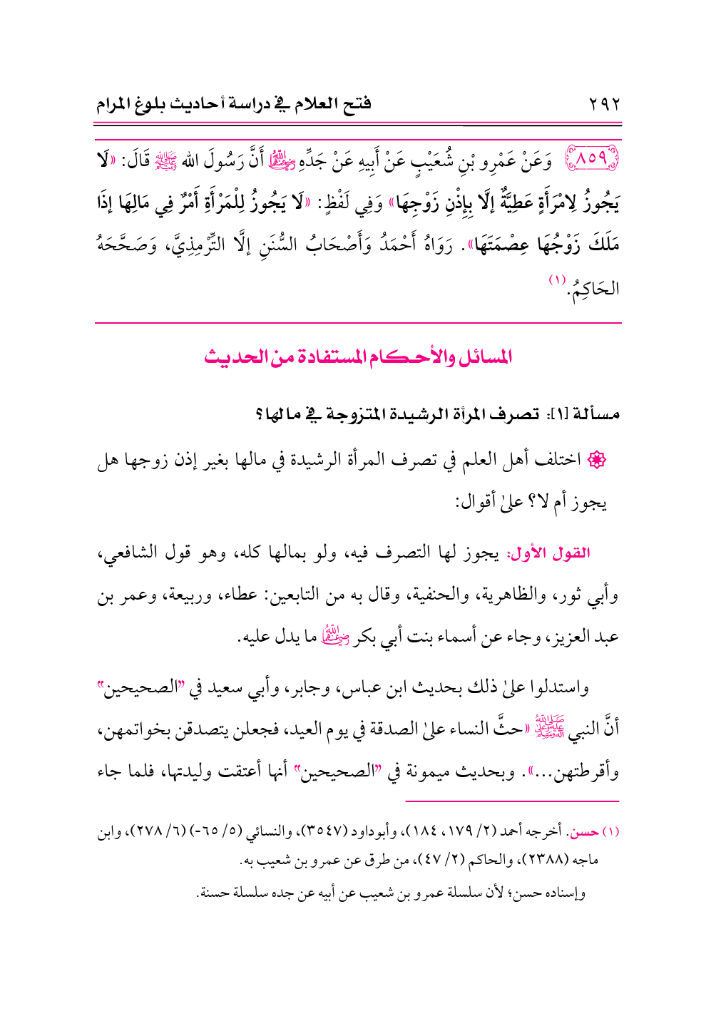 ٨٥٩ - وَعَنْ عَمْرِو بْنِ شُعَيْبٍ عَنْ أَبِيهِ عَنْ جَدِّهِ -رضي الله عنهما- أَنَّ رَسُولَ الله - صلى الله عليه وسلم - قَالَ: «لَا يَجُوزُ لِامْرَأَةٍ عَطِيَّةٌ إلَّا بِإِذْنِ زَوْجِهَا» وَفِي لَفْظٍ: «لَا يَجُوزُ لِلْمَرْأَةِ أَمْرٌ فِي مَالِهَا إذَا مَلَكَ زَوْجُهَا عِصْمَتَهَا». رَوَاهُ أَحْمَدُ وَأَصْحَابُ السُّنَنِ إلَّا التِّرْمِذِيَّ، وَصَحَّحَهُ الحَاكِمُ. (¬١)