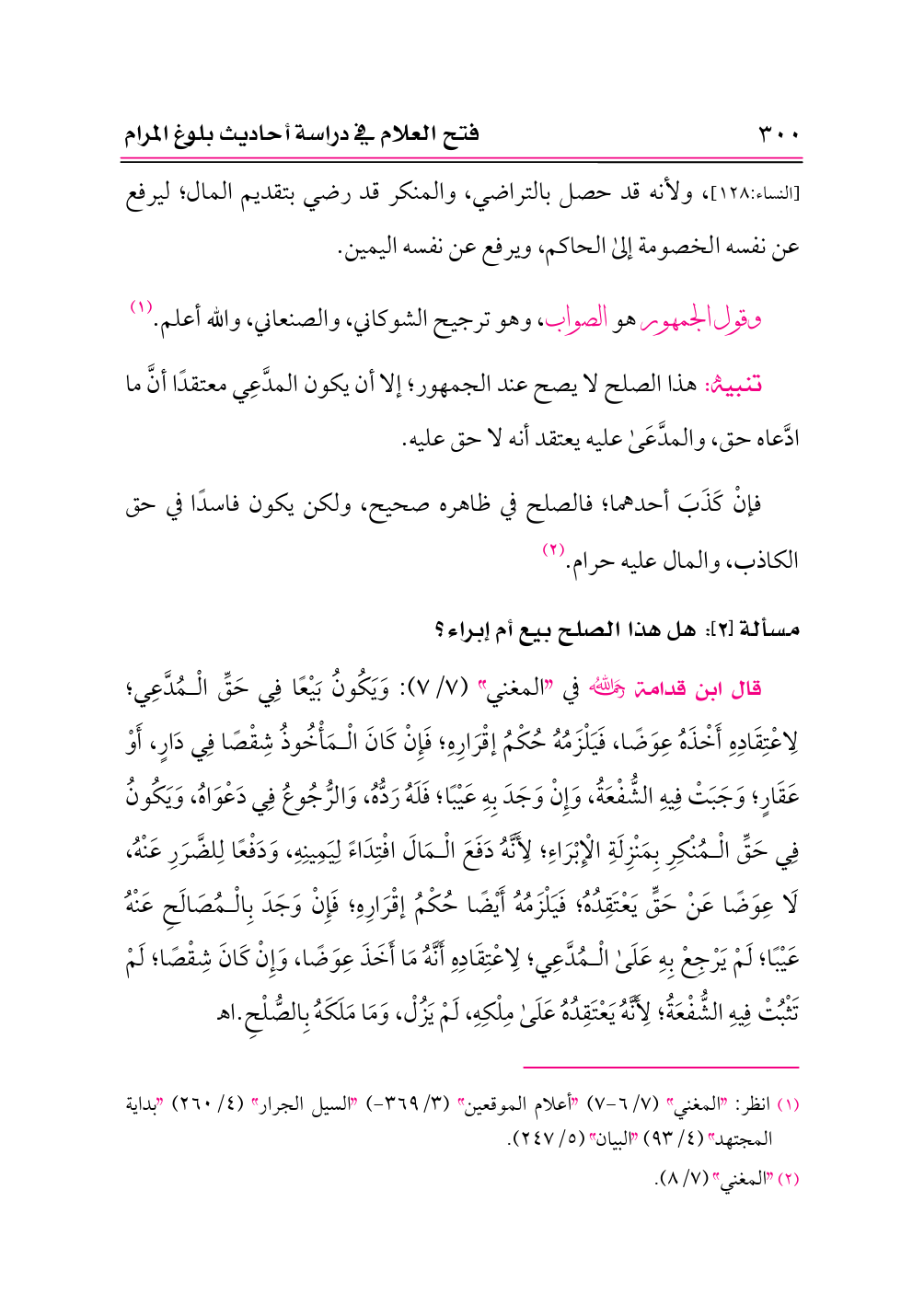 تنبيه: هذا الصلح لا يصح عند الجمهور؛ إلا أن يكون المدَّعِي معتقدًا أنَّ ما ادَّعاه حق، والمدَّعَى عليه يعتقد أنه لا حق عليه.