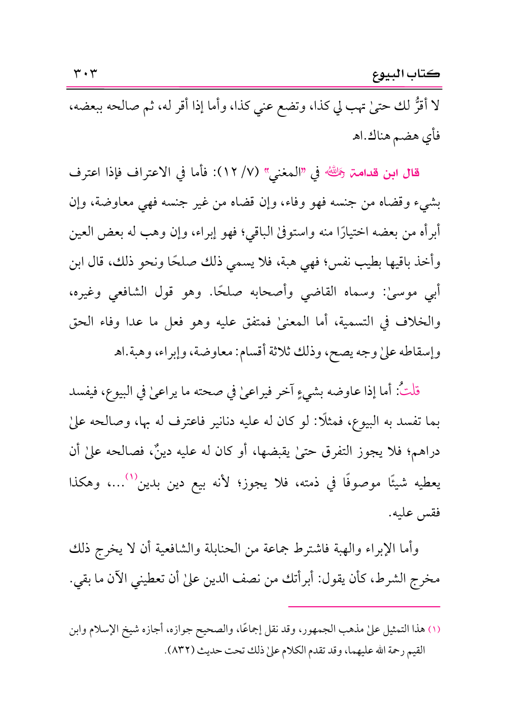 قلتُ: أما إذا عاوضه بشيءٍ آخر فيراعى في صحته ما يراعى في البيوع، فيفسد بما تفسد به البيوع، فمثلًا: لو كان له عليه دنانير فاعترف له بها، وصالحه على دراهم؛ فلا يجوز التفرق حتى يقبضها، أو كان له عليه دينٌ، فصالحه على أن يعطيه شيئًا موصوفًا في ذمته، فلا يجوز؛ لأنه بيع دين بدين (¬١) ... ، وهكذا فقس عليه.