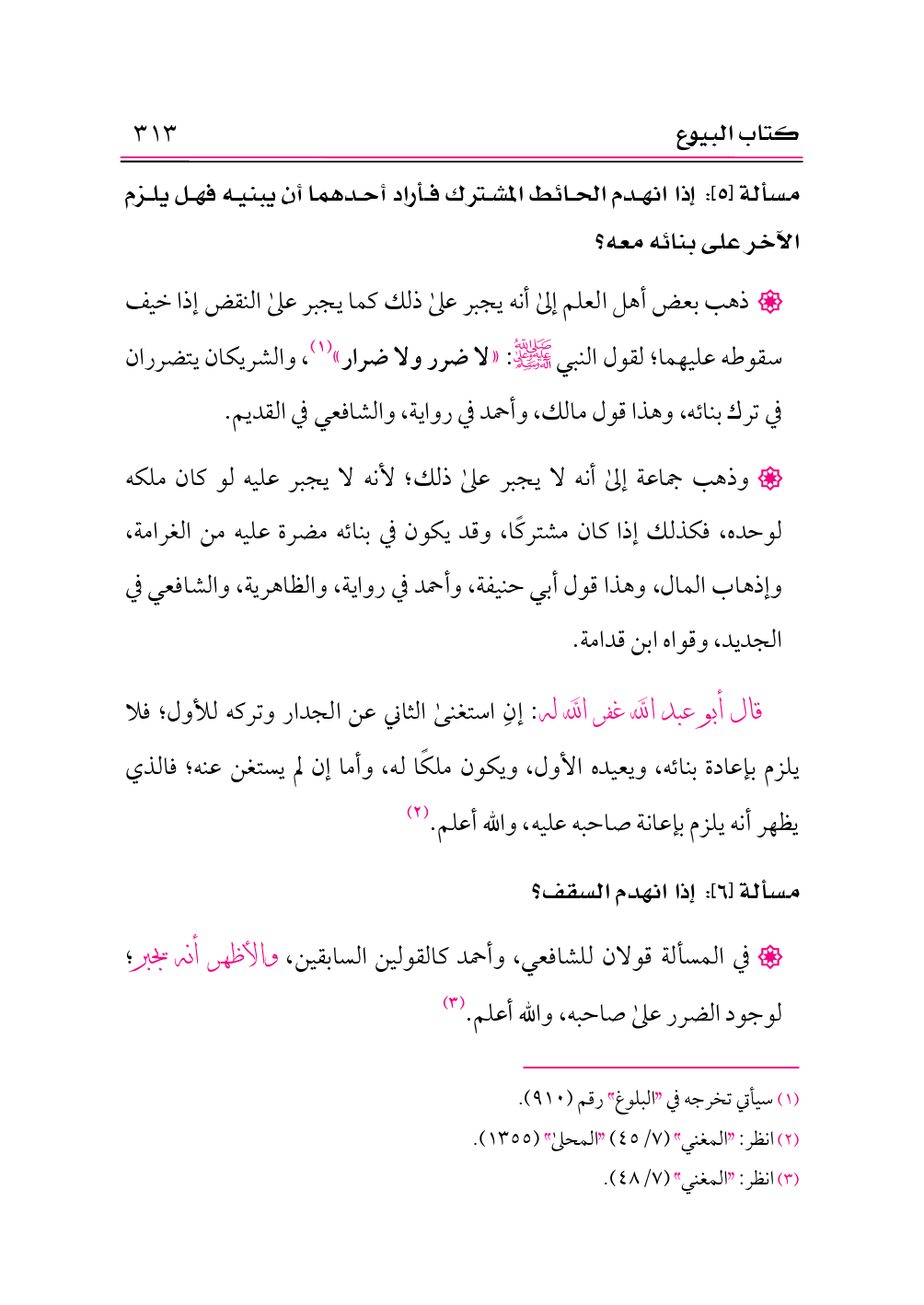 • ذهب بعض أهل العلم إلى أنه يجبر على ذلك كما يجبر على النقض إذا خيف سقوطه عليهما؛ لقول النبي -صلى الله عليه وعلى آله وسلم-: «لا ضرر ولا ضرار» (¬١)، والشريكان يتضرران في ترك بنائه، وهذا قول مالك، وأحمد في رواية، والشافعي في القديم.