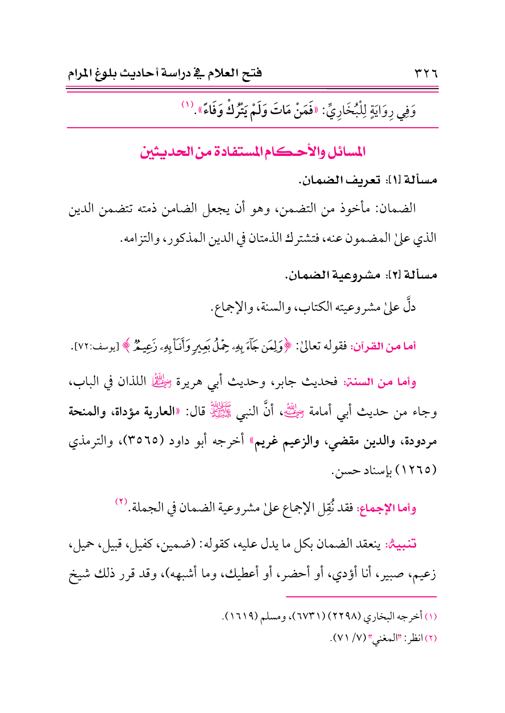 وأما من السنة: فحديث جابر، وحديث أبي هريرة -رضي الله عنهما- اللذان في الباب، وجاء من حديث أبي أمامة -رضي الله عنه-، أنَّ النبي -صلى الله عليه وعلى آله وسلم- قال: «العارية مؤداة، والمنحة مردودة، والدين مقضي، والزعيم غريم» أخرجه أبو داود (٣٥٦٥)، والترمذي (١٢٦٥) بإسناد حسن.