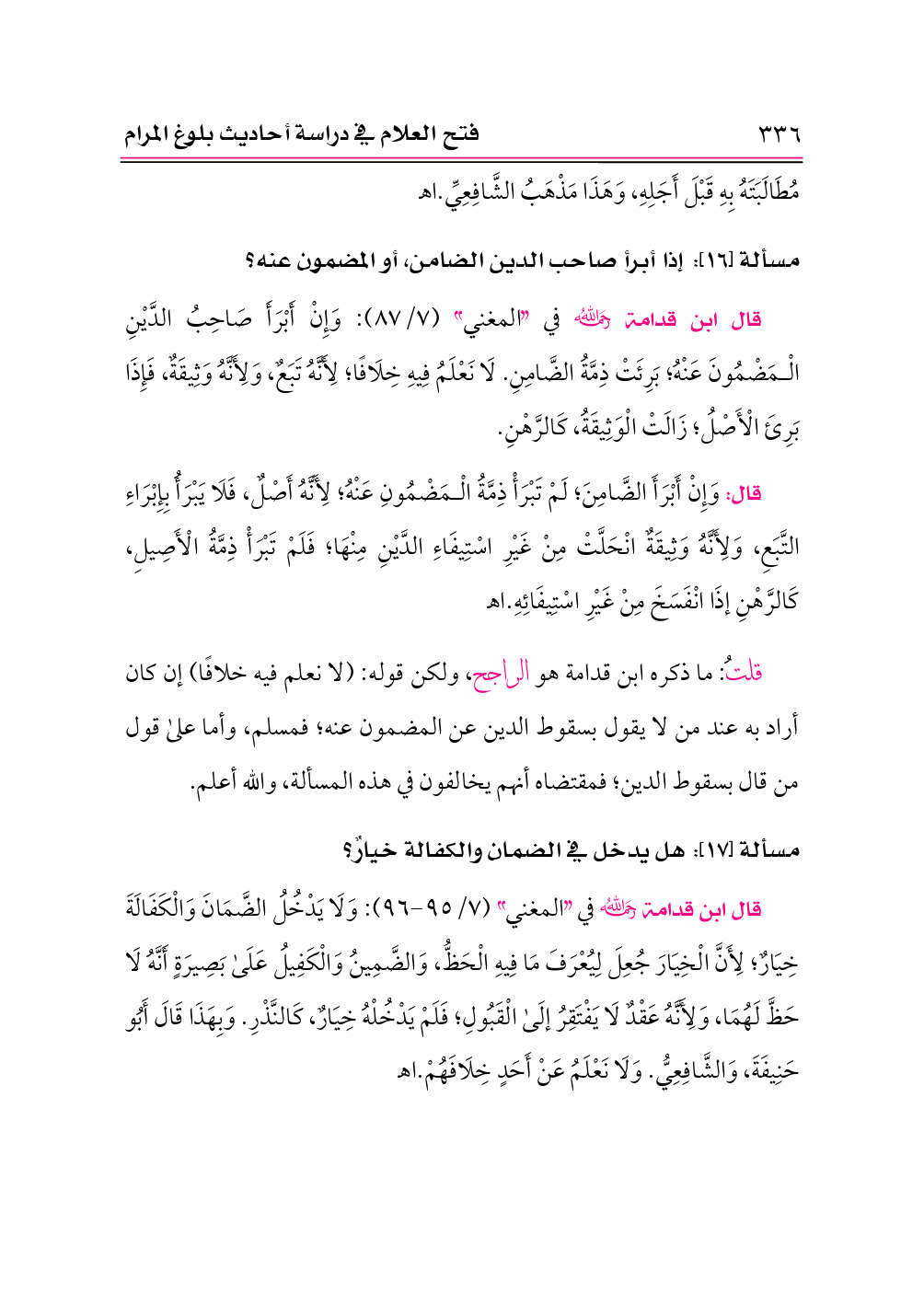 قلتُ: ما ذكره ابن قدامة هو الراجح، ولكن قوله: (لا نعلم فيه خلافًا) إن كان أراد به عند من لا يقول بسقوط الدين عن المضمون عنه؛ فمسلم، وأما على قول من قال بسقوط الدين؛ فمقتضاه أنهم يخالفون في هذه المسألة، والله أعلم.