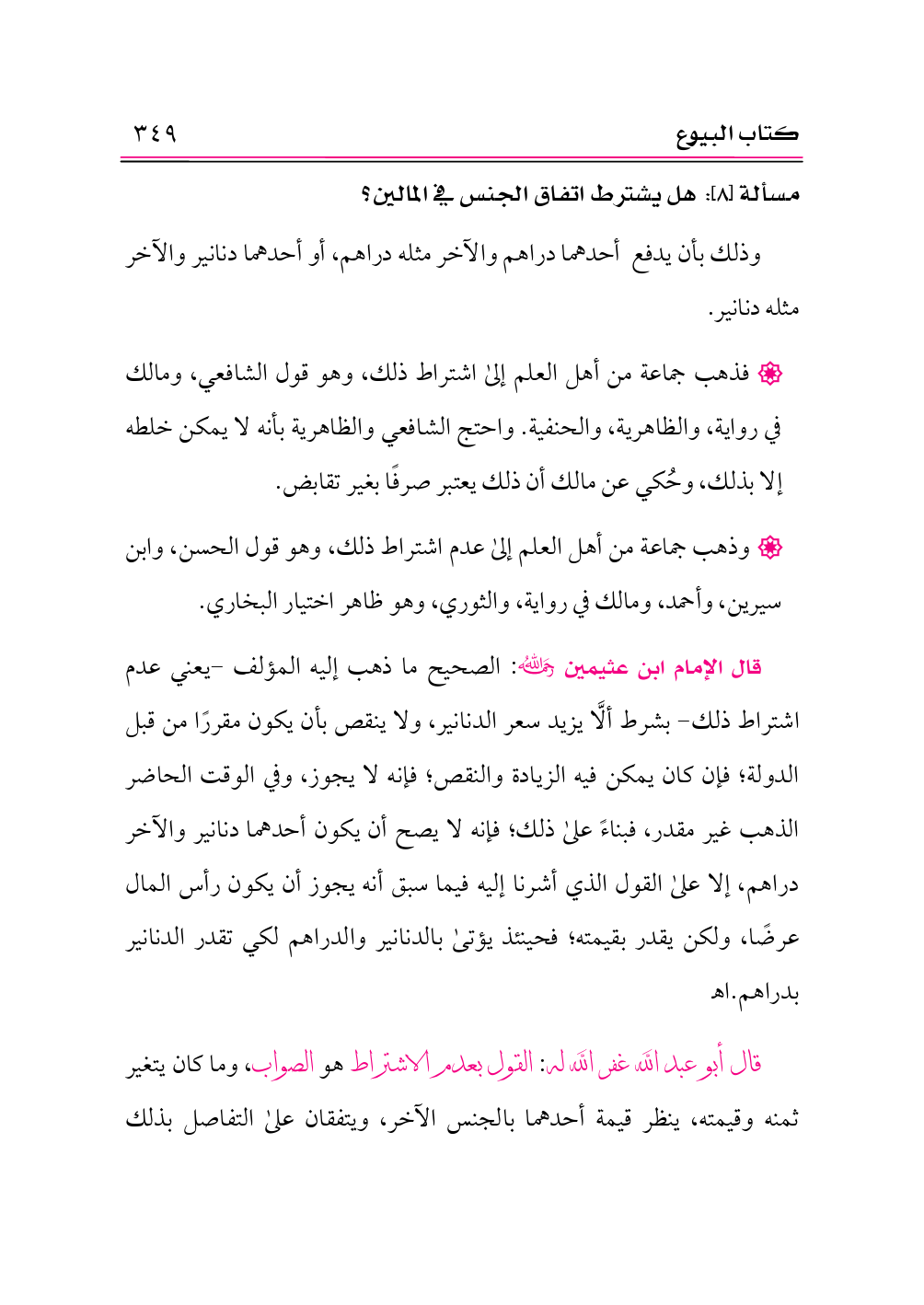 قال أبو عبد الله غفر الله له: القول بعدم الاشتراط هو الصواب، وما كان يتغير ثمنه وقيمته، ينظر قيمة أحدهما بالجنس الآخر، ويتفقان على التفاصل بذلك