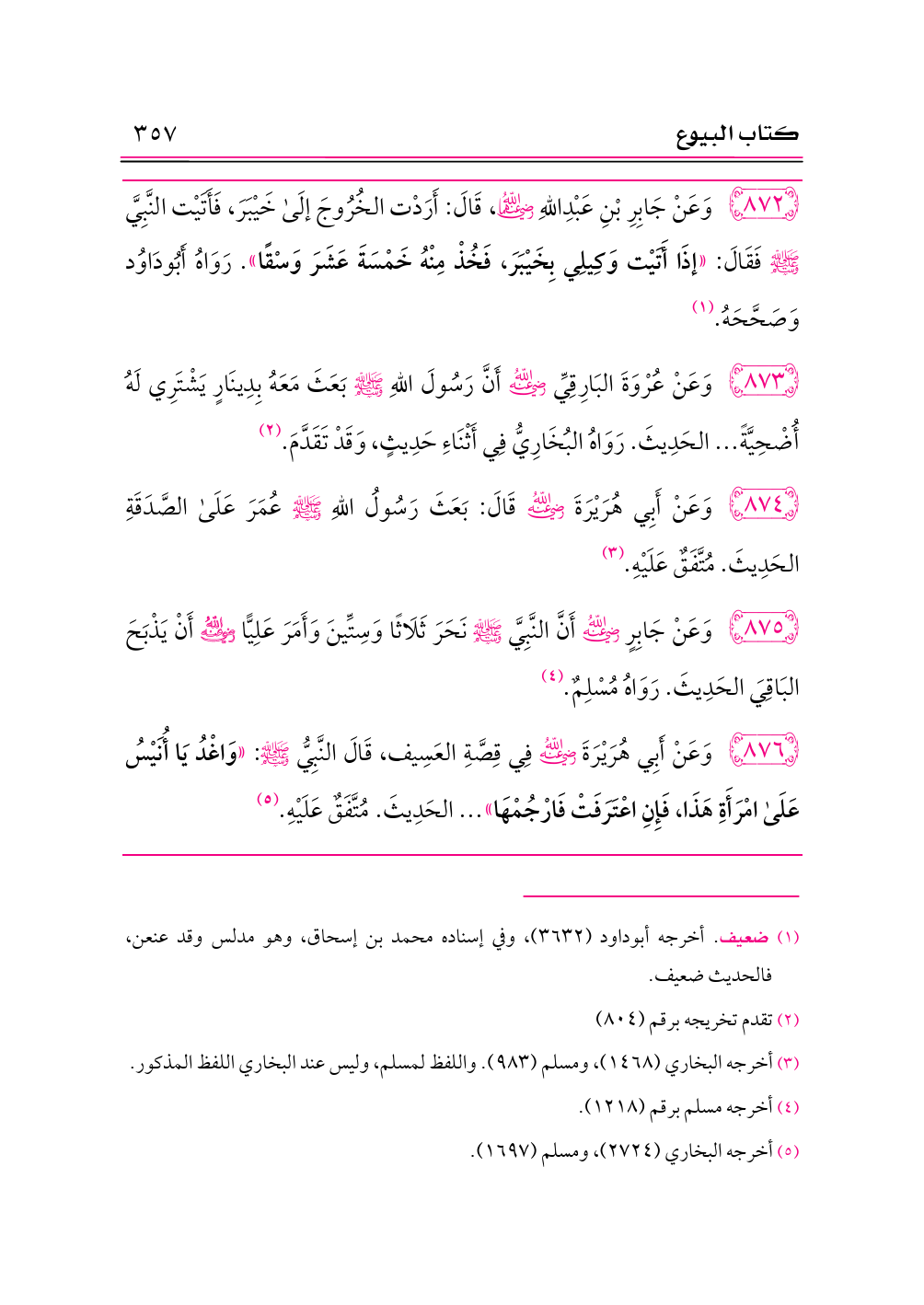 ٨٧٣ - وَعَنْ عُرْوَةَ البَارِقِيِّ -رضي الله عنه- أَنَّ رَسُولَ اللهِ - صلى الله عليه وسلم - بَعَثَ مَعَهُ بِدِينَارٍ يَشْتَرِي لَهُ أُضْحِيَّةً ... الحَدِيثَ. رَوَاهُ البُخَارِيُّ فِي أَثْنَاءِ حَدِيثٍ، وَقَدْ تَقَدَّمَ. (¬٢)