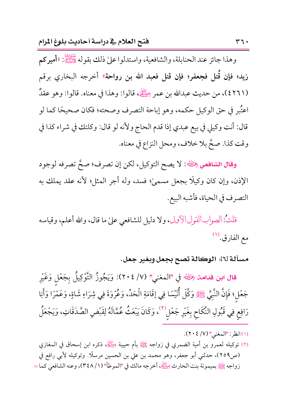 (¬٢) توكيله لعمرو بن أمية الضمري في زواجه - صلى الله عليه وسلم - بأم حبيبة -رضي الله عنها-، ذكره ابن إسحاق في المغازي (ص ٢٥٩)، حدثني أبو جعفر، وهو محمد بن علي بن الحسين مرسلًا. وتوكيله لأبي رافع في زواجه - صلى الله عليه وسلم - بميمونة بنت الحارث -رضي الله عنها-، أخرجه مالك في «الموطأ» (١/ ٣٤٨)، وعنه الشافعي كما في «المسند» (١/ ١٨٠) عن ربيعة بن أبي عبد الرحمن، عن سليمان بن يسار؛ أن رسول الله - صلى الله عليه وسلم - بعث أبا رافع مولاه، ورجلا من الأنصار، فزوجاه ميمونة بنت الحارث. ورسول الله - صلى الله عليه وسلم - بالمدينة، قبل أن يخرج. وهذا إسنادٌ مرسلٌ.