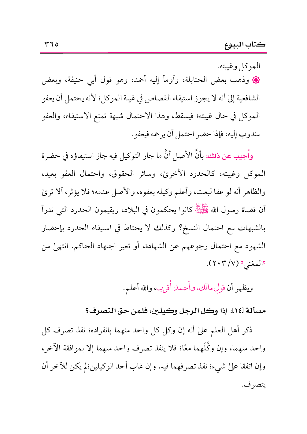 وأُجيب عن ذلك: بأنَّ الأصل أنَّ ما جاز التوكيل فيه جاز استيفاؤه في حضرة الموكل وغيبته، كالحدود الأخرى، وسائر الحقوق، واحتمال العفو بعيد، والظاهر أنه لو عفا لبعث، وأعلم وكيله بعفوه، والأصل عدمه؛ فلا يؤثر، ألا ترى أن قضاة رسول الله -صلى الله عليه وعلى آله وسلم- كانوا يحكمون في البلاد، ويقيمون الحدود التي تدرأ بالشبهات مع احتمال النسخ؟ وكذلك لا يحتاط في استيفاء الحدود بإحضار الشهود مع احتمال رجوعهم عن الشهادة، أو تغير اجتهاد الحاكم. انتهى من «المغني» (٧/ ٢٠٣).