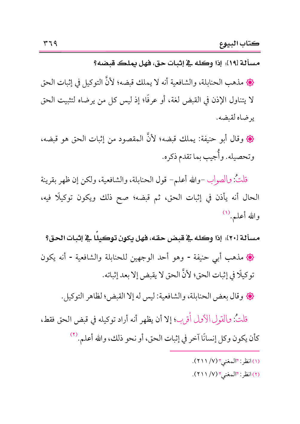 قلتُ: والصواب -والله أعلم- قول الحنابلة، والشافعية، ولكن إن ظهر بقرينة الحال أنه يأذن في إثبات الحق، ثم قبضه؛ صح ذلك ويكون توكيلًا فيه، والله أعلم. (¬١)