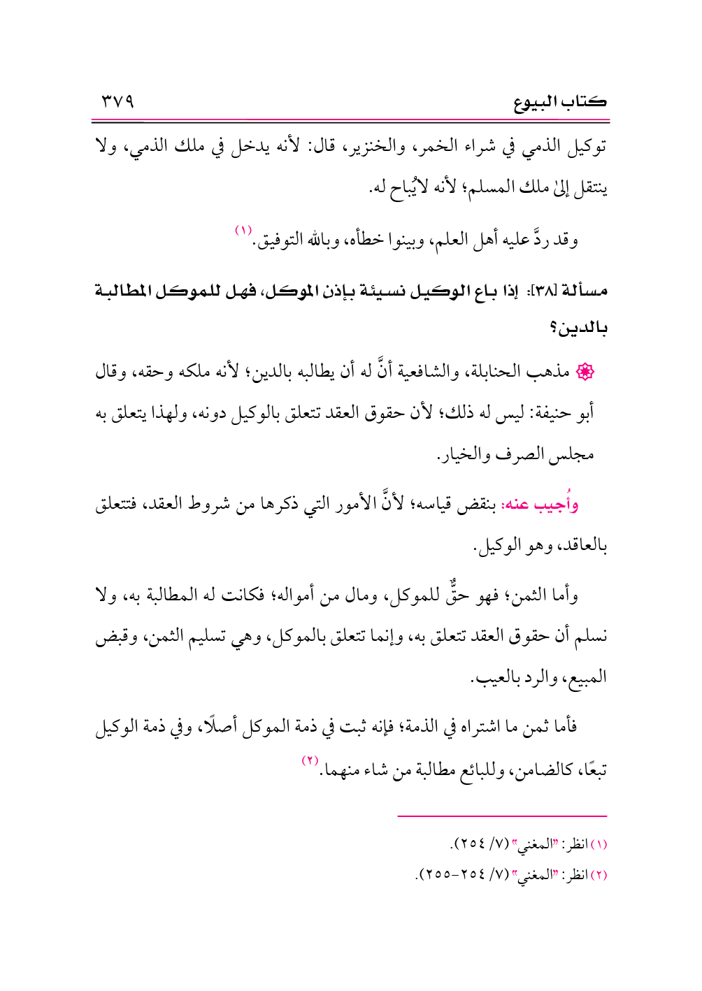 وأما الثمن؛ فهو حقٌّ للموكل، ومال من أمواله؛ فكانت له المطالبة به، ولا نسلم أن حقوق العقد تتعلق به، وإنما تتعلق بالموكل، وهي تسليم الثمن، وقبض المبيع، والرد بالعيب.