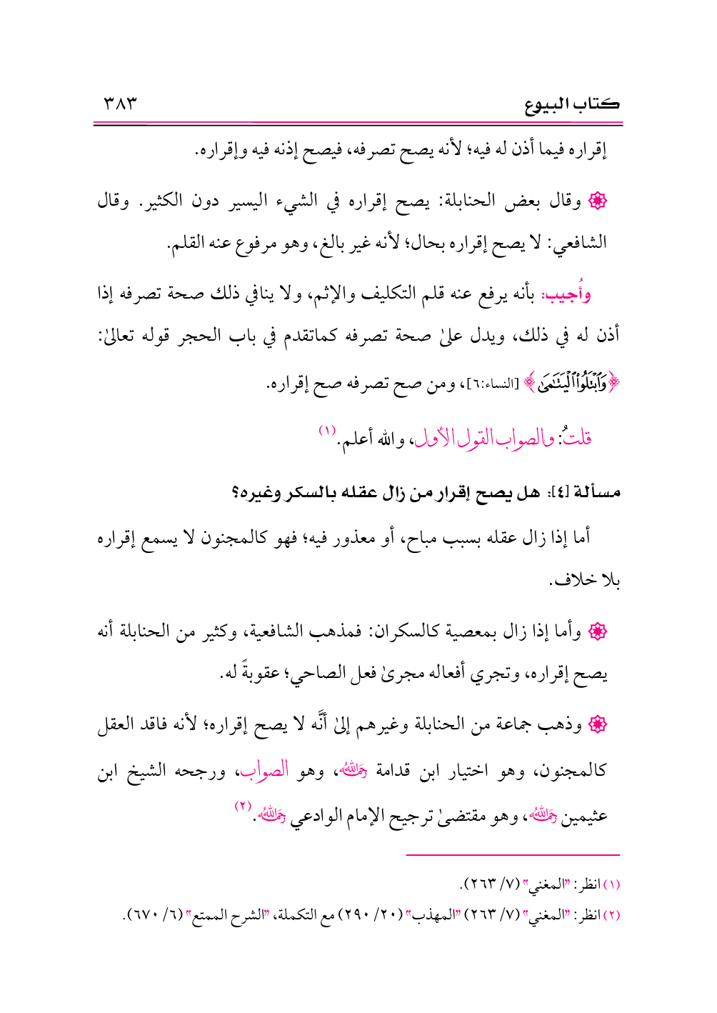 • وذهب جماعة من الحنابلة وغيرهم إلى أنَّه لا يصح إقراره؛ لأنه فاقد العقل كالمجنون، وهو اختيار ابن قدامة -رحمه الله-، وهو الصواب، ورجحه الشيخ ابن عثيمين -رحمه الله-، وهو مقتضى ترجيح الإمام الوادعي -رحمه الله-. (¬٢)