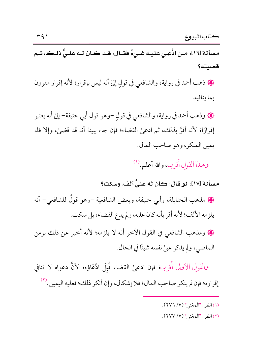 • مذهب الحنابلة، وأبي حنيفة، وبعض الشافعية -وهو قولٌ للشافعي- أنه يلزمه الألف؛ لأنه أقر بأنه كان عليه، ولم يدع القضاء، بل سكت.