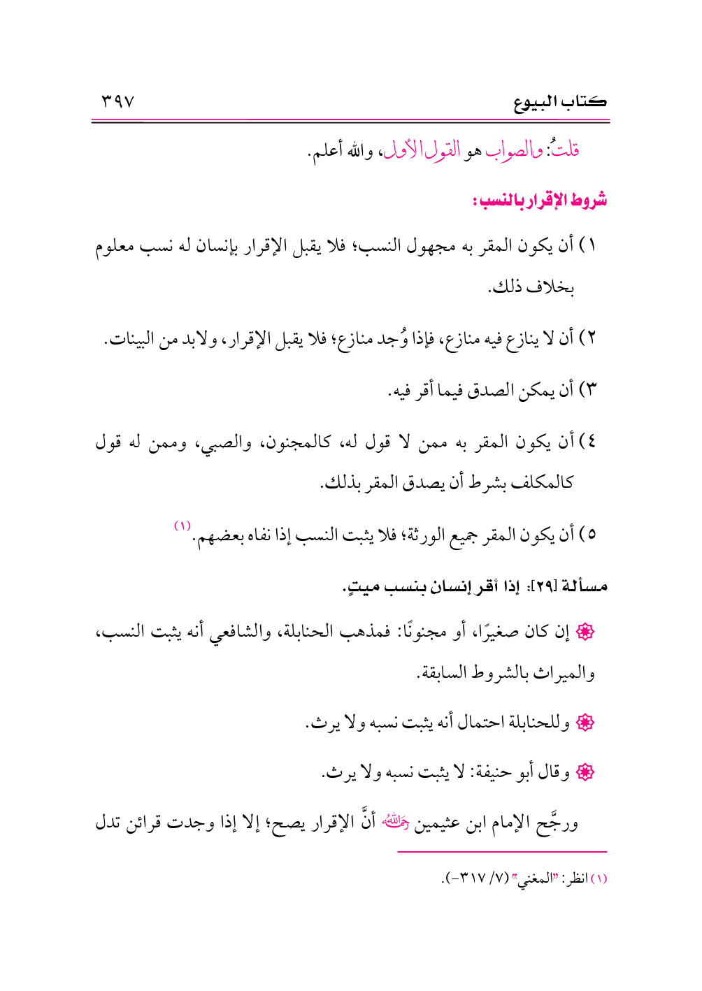 مسألة [٢٩]: إذا أقر إنسان بنسب ميتٍ.