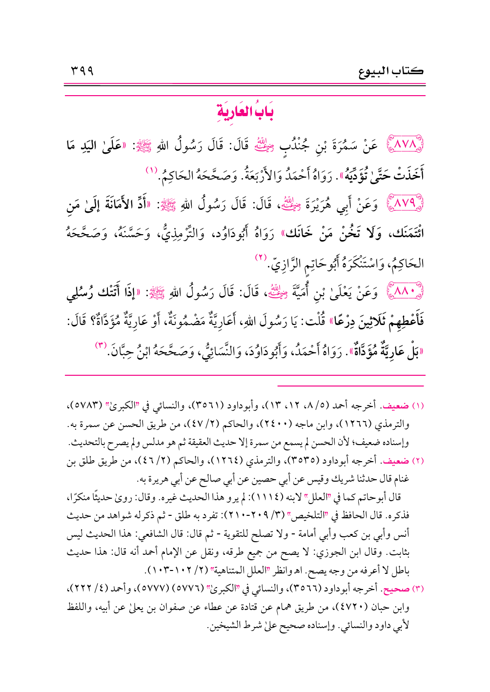 ٨٧٨ - عَنْ سَمُرَةَ بْنِ جُنْدُبٍ -رضي الله عنه- قَالَ: قَالَ رَسُولُ اللهِ - صلى الله عليه وسلم -: «عَلَى اليَدِ مَا أَخَذَتْ حَتَّى تُؤَدِّيَهُ». رَوَاهُ أَحْمَدُ وَالأَرْبَعَةُ. وَصَحَّحَهُ الحَاكِمُ. (¬١)