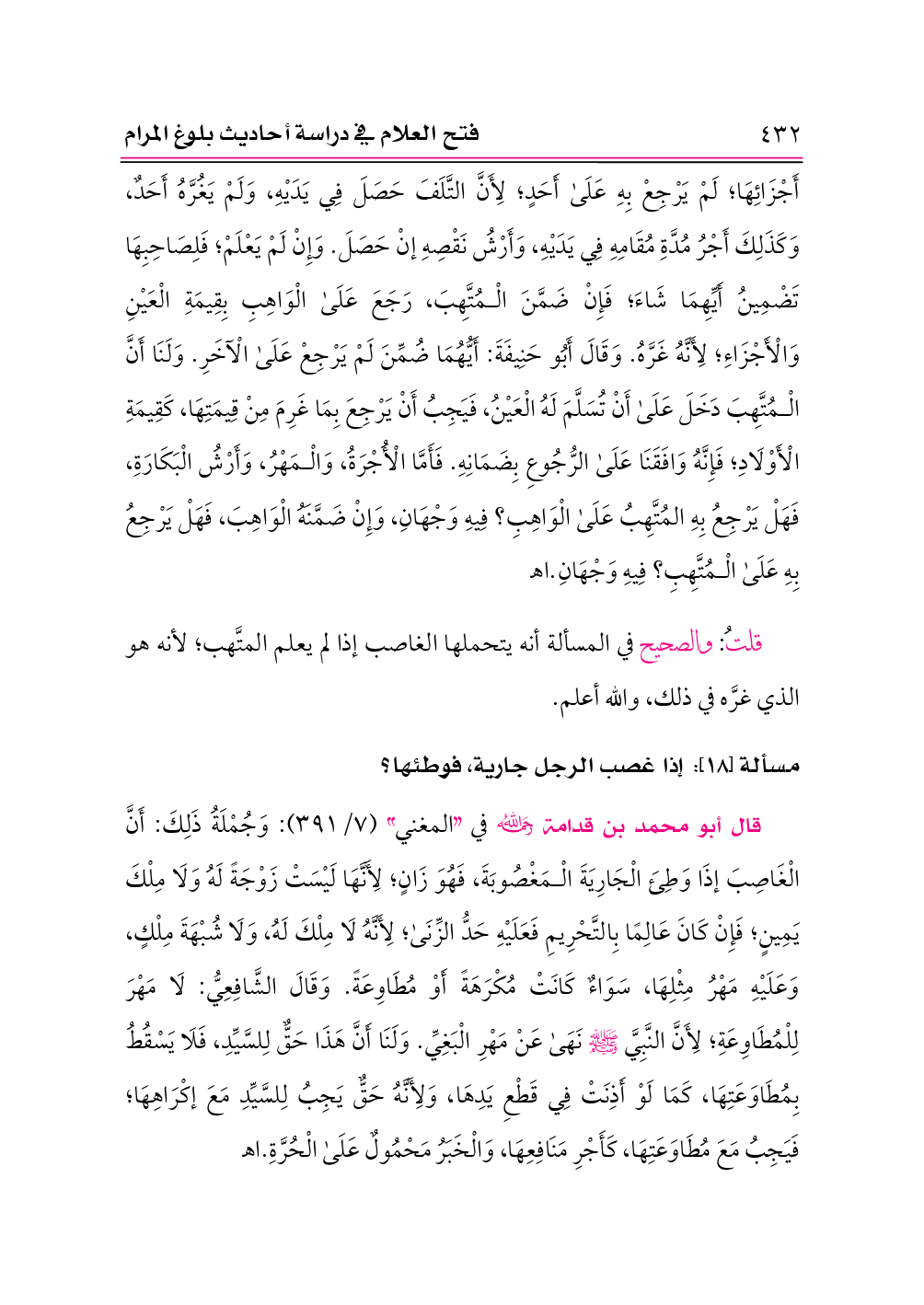 قلتُ: والصحيح في المسألة أنه يتحملها الغاصب إذا لم يعلم المتَّهب؛ لأنه هو الذي غرَّه في ذلك، والله أعلم.