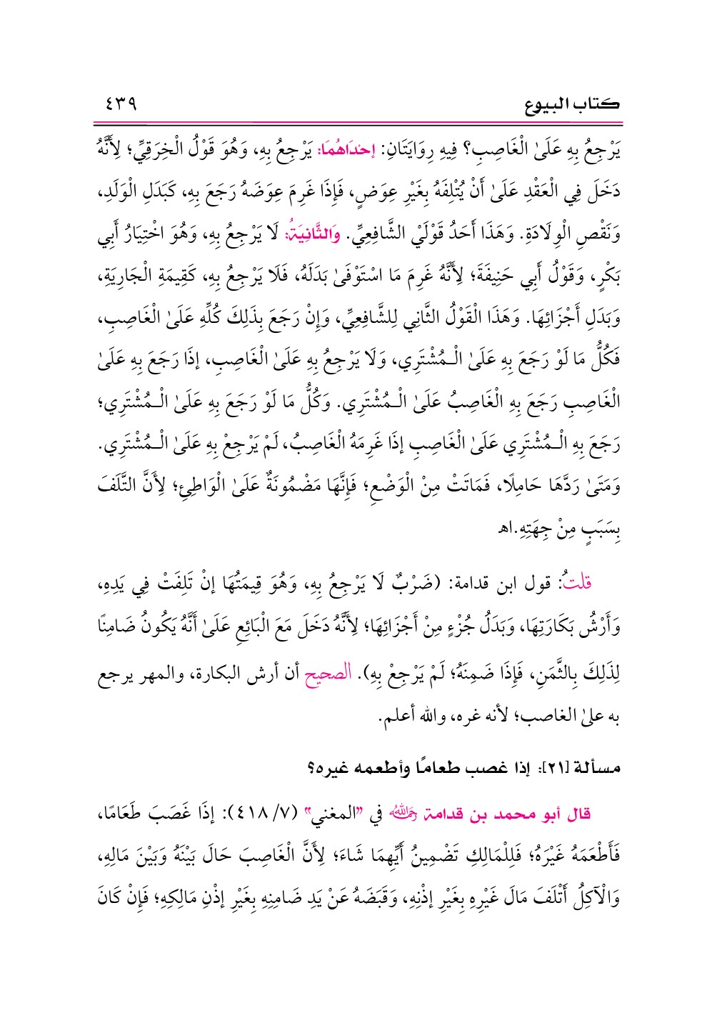 قلتُ: قول ابن قدامة: (ضَرْبٌ لَا يَرْجِعُ بِهِ، وَهُوَ قِيمَتُهَا إنْ تَلِفَتْ فِي يَدِهِ، وَأَرْشُ بَكَارَتِهَا، وَبَدَلُ جُزْءٍ مِنْ أَجْزَائِهَا؛ لِأَنَّهُ دَخَلَ مَعَ الْبَائِعِ عَلَى أَنَّهُ يَكُونُ ضَامِنًا لِذَلِكَ بِالثَّمَنِ، فَإِذَا ضَمِنَهُ؛ لَمْ يَرْجِعْ بِهِ). الصحيح أن أرش البكارة، والمهر يرجع به على الغاصب؛ لأنه غره، والله أعلم.