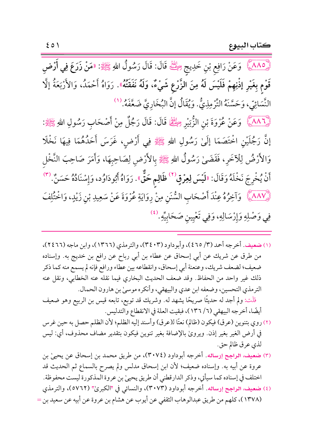 ٨٨٥ - وَعَنْ رَافِعِ بْنِ خَدِيجٍ -رضي الله عنه- قَالَ: قَالَ رَسُولُ اللهِ - صلى الله عليه وسلم -: «مَنْ زَرَعَ فِي أَرْضِ قَوْمٍ بِغَيْرِ إذْنِهِمْ فَلَيْسَ لَهُ مِنَ الزَّرْعِ شَيْءٌ، وَلَهُ نَفَقَتُهُ». رَوَاهُ أَحْمَدُ، وَالأَرْبَعَةُ إلَّا النَّسَائِيّ، وَحَسَّنَهُ التِّرْمِذِيُّ. وَيُقَالُ إنَّ البُخَارِيَّ ضَعَّفَهُ. (¬١)