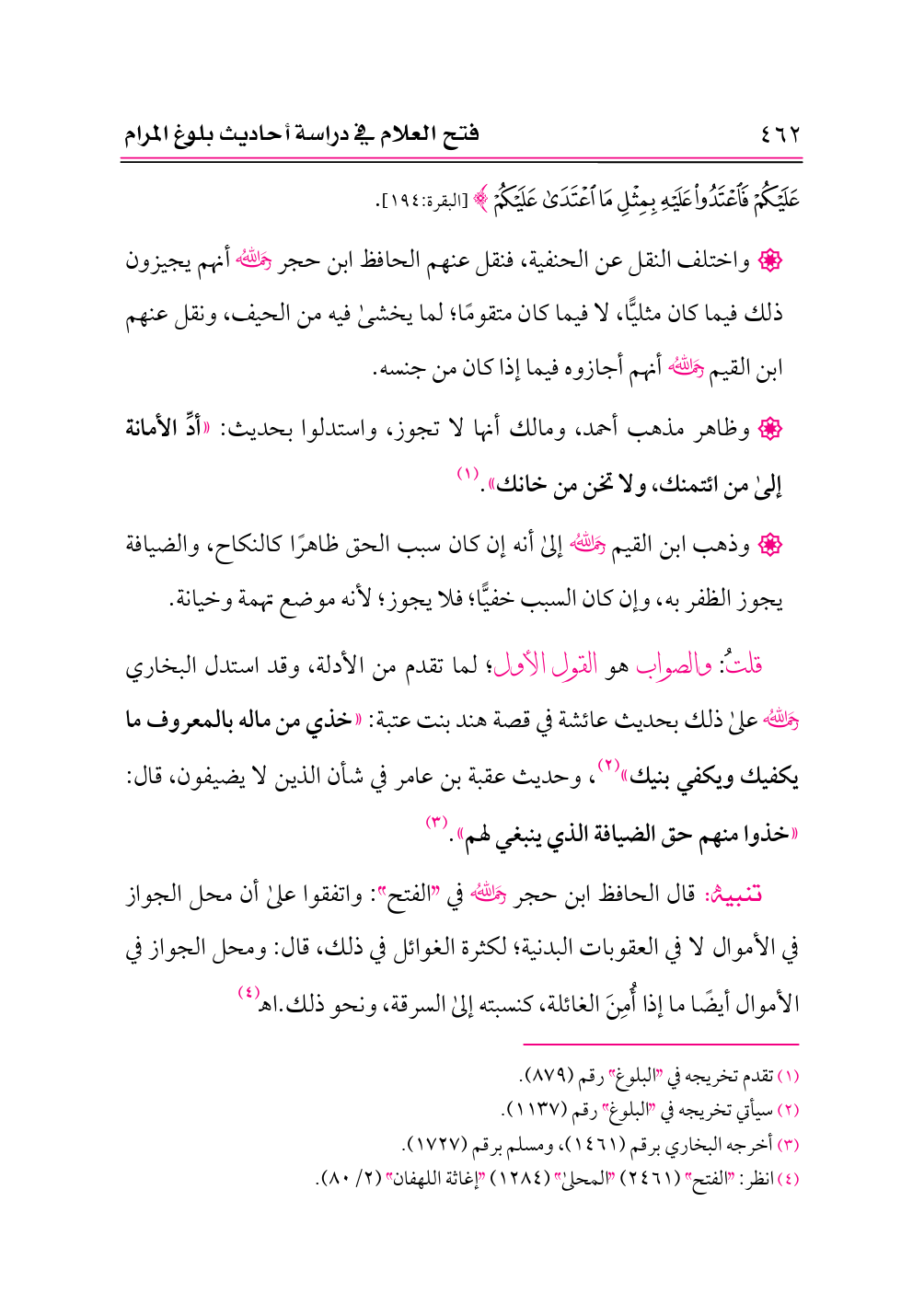 قلتُ: والصواب هو القول الأول؛ لما تقدم من الأدلة، وقد استدل البخاري -رحمه الله- على ذلك بحديث عائشة في قصة هند بنت عتبة: «خذي من ماله بالمعروف ما يكفيك ويكفي بنيك» (¬٢)، وحديث عقبة بن عامر في شأن الذين لا يضيفون، قال: «خذوا منهم حق الضيافة الذي ينبغي لهم». (¬٣)