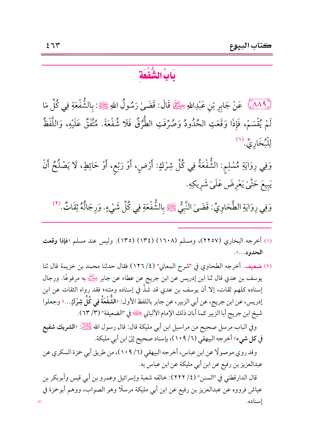 (¬٢) ضعيف. أخرجه الطحاوي في «شرح المعاني» (٤/ ١٢٦) فقال حدثنا محمد بن خزيمة قال ثنا يوسف بن عدي قال ثنا ابن إدريس عن ابن جريج عن عطاء عن جابر -رضي الله عنه- به مرفوعًا. ورجال إسناده كلهم ثقات، إلا أن يوسف بن عدي قد شذَّ في إسناده ومتنه؛ فقد رواه الثقات عن ابن إدريس، عن ابن جريج، عن أبي الزبير، عن جابر باللفظ الأول: «الشُّفْعَةُ فِي كُلِّ شِرْكٍ ... » وجعلوا شيخ ابن جريج أبا الزبير كما أبان ذلك الإمام الألباني -رحمه الله- في «الضعيفة» (٣/ ٦٣).