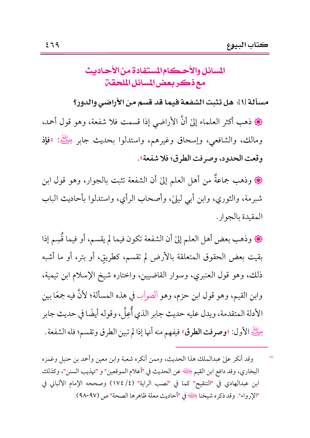 • وذهب بعض أهل العلم إلى أن الشفعة تكون فيما لم يقسم، أو فيما قُسِم إذا بقيت بعض الحقوق المتعلقة بالأرض لم تقسم، كطريقٍ، أو بئر، أو ما أشبه ذلك، وهو قول العنبري، وسوار القاضيين، واختاره شيخ الإسلام ابن تيمية، وابن القيم، وهو قول ابن حزم، وهو الصواب في هذه المسألة؛ لأنَّ فيه جمعًا بين الأدلة المتقدمة، ويدل عليه حديث جابر الذي أُعِلَّ، وقوله أيضًا في حديث جابر -رضي الله عنه- الأول: «وصرفت الطرق» فيفهم منه أنها إذا لم تبين الطرق وتقسم؛ فله الشفعة.