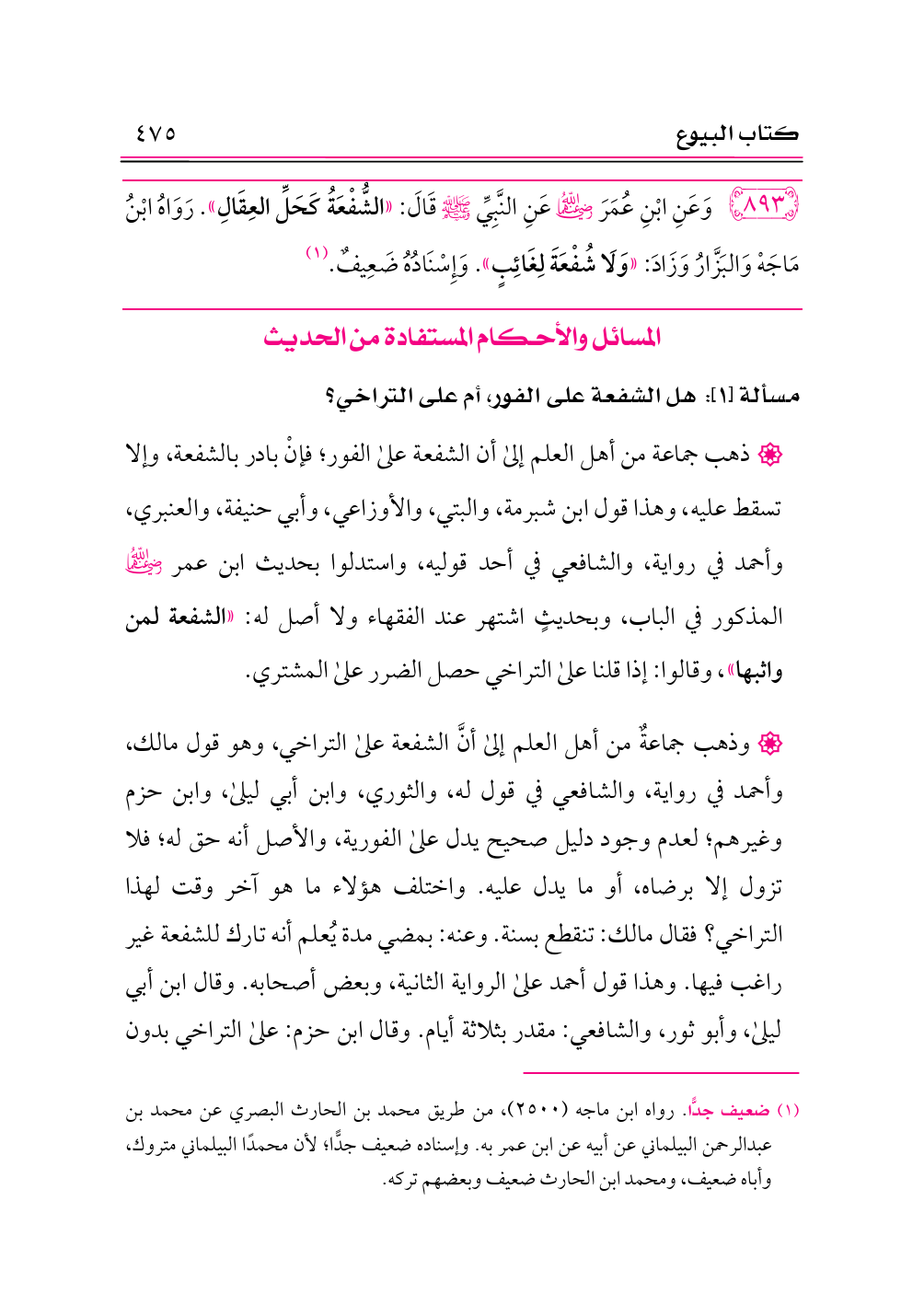 ٨٩٣ - وَعَنِ ابْنِ عُمَرَ -رضي الله عنهما- عَنِ النَّبِيِّ - صلى الله عليه وسلم - قَالَ: «الشُّفْعَةُ كَحَلِّ العِقَالِ». رَوَاهُ ابْنُ مَاجَهْ وَالبَزَّارُ وَزَادَ: «وَلَا شُفْعَةَ لِغَائِبٍ». وَإِسْنَادُهُ ضَعِيفٌ. (¬١)