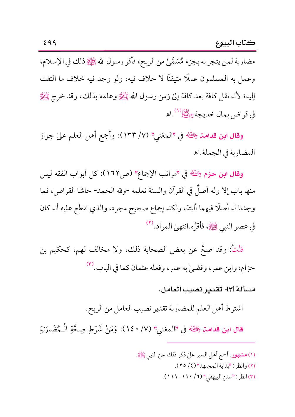 وقال ابن حزم -رحمه الله- في «مراتب الإجماع» (ص ١٦٢): كل أبواب الفقه ليس منها باب إلا وله أصلٌ في القرآن والسنة نعلمه ولله الحمد حاشا القراض، فما وجدنا له أصلًا فيهما ألبتة، ولكنه إجماع صحيح مجرد، والذي نقطع عليه أنه كان في عصر النبي - صلى الله عليه وسلم -، فأقرَّه. انتهى المراد. (¬٢)