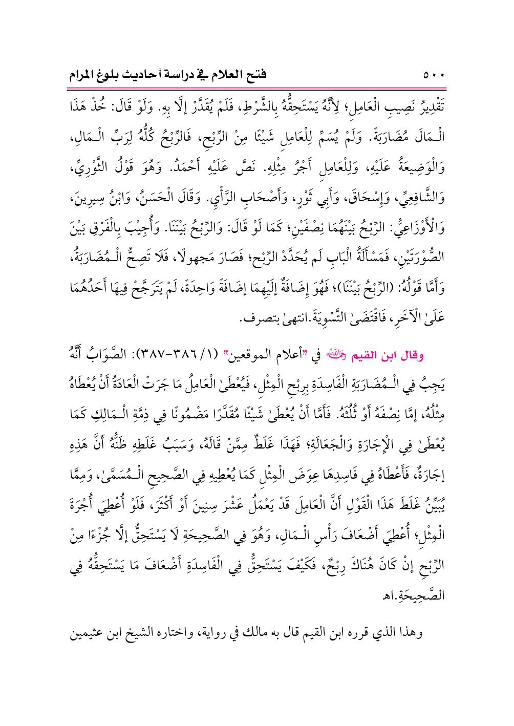 وقال ابن القيم -رحمه الله- في «أعلام الموقعين» (١/ ٣٨٦ - ٣٨٧): الصَّوَابُ أَنَّهُ يَجِبُ فِي الْمُضَارَبَةِ الْفَاسِدَةِ بِرِبْحِ الْمِثْلِ، فَيُعْطَى الْعَامِلُ مَا جَرَتْ الْعَادَةُ أَنْ يُعْطَاهُ مِثْلُهُ، إمَّا نِصْفَهُ أَوْ ثُلُثَهُ. فَأَمَّا أَنْ يُعْطَى شَيْئًا مُقَدَّرًا مَضْمُونًا فِي ذِمَّةِ الْمَالِكِ كَمَا يُعْطَى فِي الْإِجَارَةِ وَالْجَعَالَةِ؛ فَهَذَا غَلَطٌ مِمَّنْ قَالَهُ، وَسَبَبُ غَلَطِهِ ظَنُّهُ أَنَّ هَذِهِ إجَارَةٌ، فَأَعْطَاهُ فِي فَاسِدِهَا عِوَضَ الْمِثْلِ كَمَا يُعْطِيهِ فِي الصَّحِيحِ الْمُسَمَّى، وَمِمَّا يُبَيِّنُ غَلَطَ هَذَا الْقَوْلِ أَنَّ الْعَامِلَ قَدْ يَعْمَلُ عَشْرَ سِنِينَ أَوْ أَكْثَرَ، فَلَوْ أُعْطِيَ أُجْرَةَ الْمِثْلِ؛ أُعْطِيَ أَضْعَافَ رَأْسِ الْمَالِ، وَهُوَ فِي الصَّحِيحَةِ لَا يَسْتَحِقُّ إلَّا جُزْءًا مِنْ الرِّبْحِ إنْ كَانَ هُنَاكَ رِبْحٌ، فَكَيْفَ يَسْتَحِقُّ فِي الْفَاسِدَةِ أَضْعَافَ مَا يَسْتَحِقُّهُ فِي الصَّحِيحَةِ. اهـ