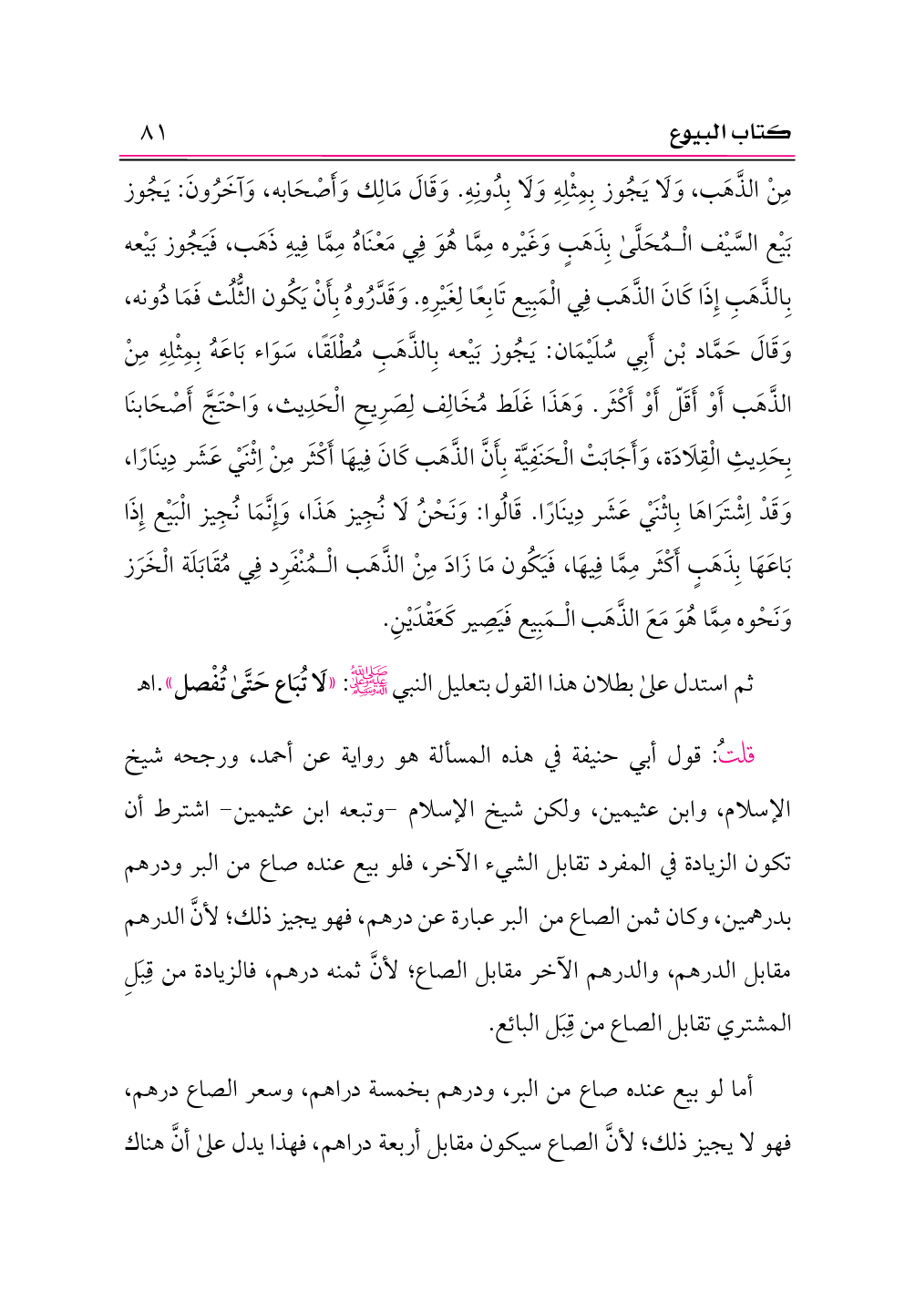 ثم استدل على بطلان هذا القول بتعليل النبي -صلى الله عليه وعلى آله وسلم-: «لَا تُبَاع حَتَّى تُفْصل».اهـ
