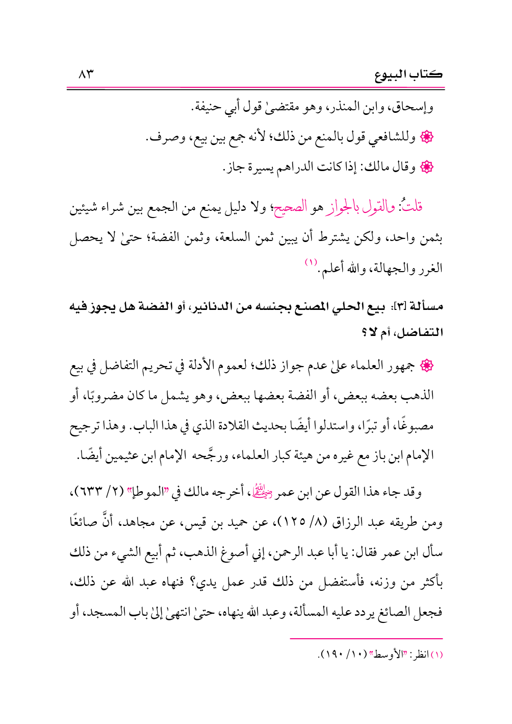 مسألة [٣]: بيع الحلي المصنع بجنسه من الدنانير، أو الفضة هل يجوز فيه التفاضل، أم لا؟