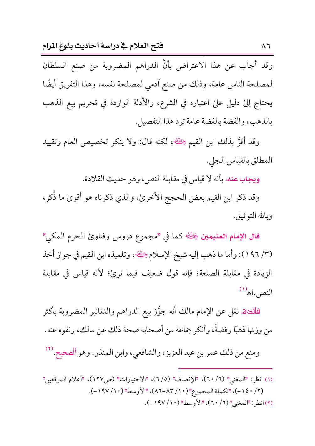 قال الإمام العثيمين -رحمه الله- كما في «مجموع دروس وفتاوى الحرم المكي» (٣/ ١٩٦): وأما ما ذهب إليه شيخ الإسلام -رحمه الله-، وتلميذه ابن القيم في جواز أخذ الزيادة في مقابلة الصنعة؛ فإنه قول ضعيف فيما نرى؛ لأنه قياس في مقابلة النص. اهـ (¬١)