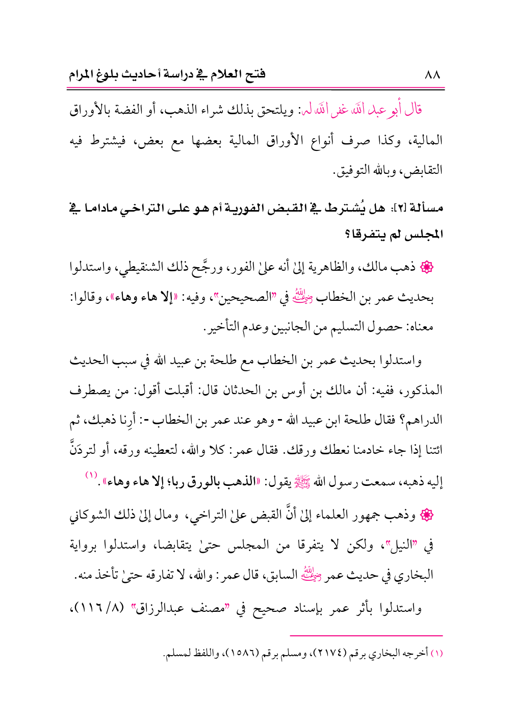 • وذهب جمهور العلماء إلى أنَّ القبض على التراخي، ومال إلى ذلك الشوكاني في «النيل»، ولكن لا يتفرقا من المجلس حتى يتقابضا، واستدلوا برواية البخاري في حديث عمر -رضي الله عنه- السابق، قال عمر: والله، لا تفارقه حتى تأخذ منه.
