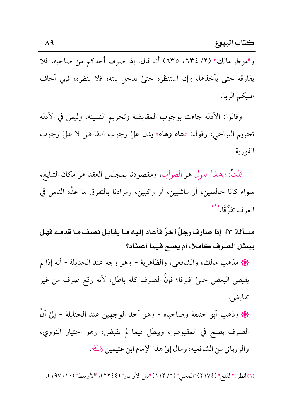 و «موطإ مالك» (٢/ ٦٣٤، ٦٣٥) أنه قال: إذا صرف أحدكم من صاحبه، فلا يفارقه حتى يأخذها، وإن استنظره حتى يدخل بيته؛ فلا ينظره، فإني أخاف عليكم الربا.