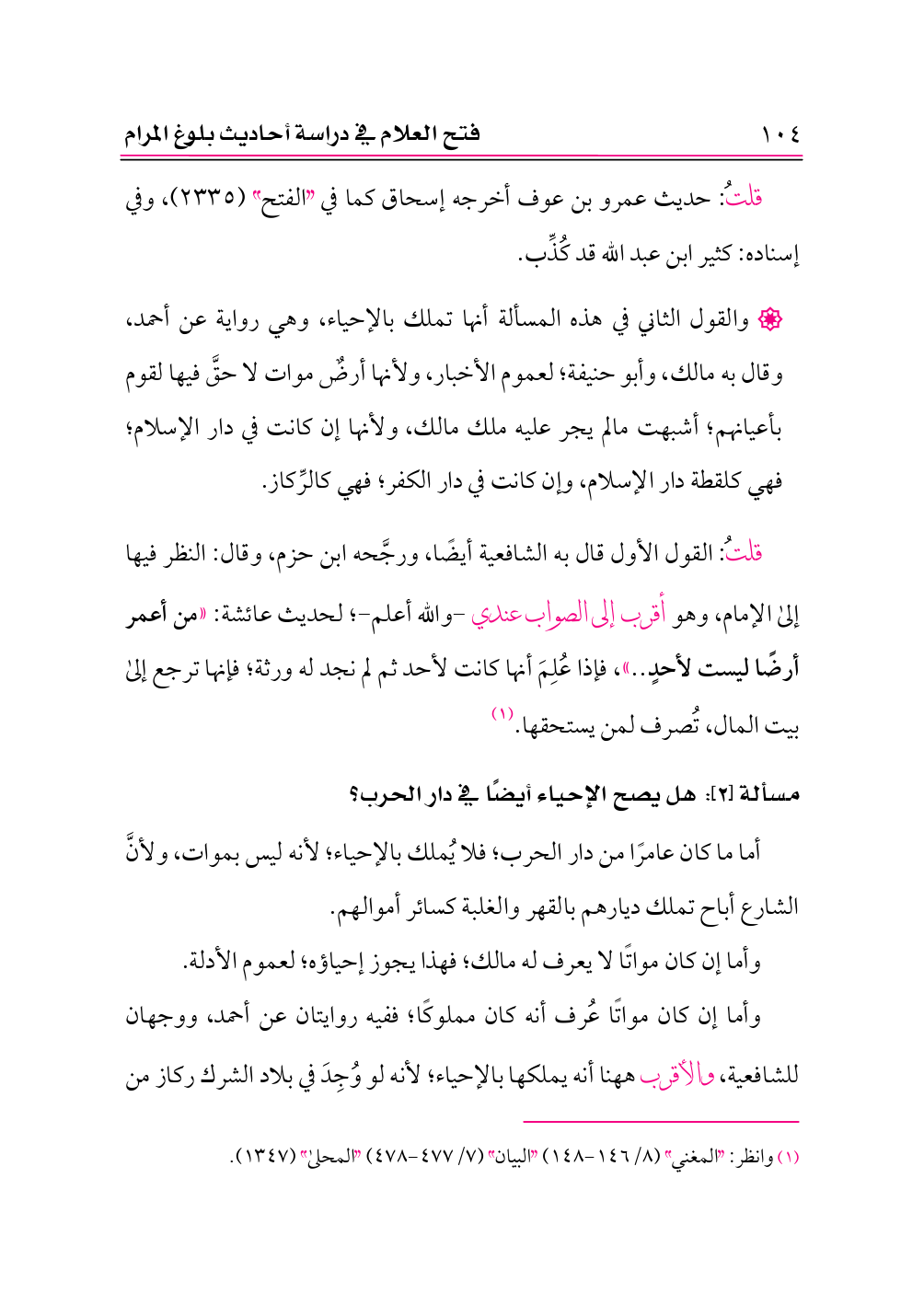 قلتُ: القول الأول قال به الشافعية أيضًا، ورجَّحه ابن حزم، وقال: النظر فيها إلى الإمام، وهو أقرب إلى الصواب عندي -والله أعلم-؛ لحديث عائشة: «من أعمر أرضًا ليست لأحدٍ .. »، فإذا عُلِمَ أنها كانت لأحد ثم لم نجد له ورثة؛ فإنها ترجع إلى بيت المال، تُصرف لمن يستحقها. (¬١)