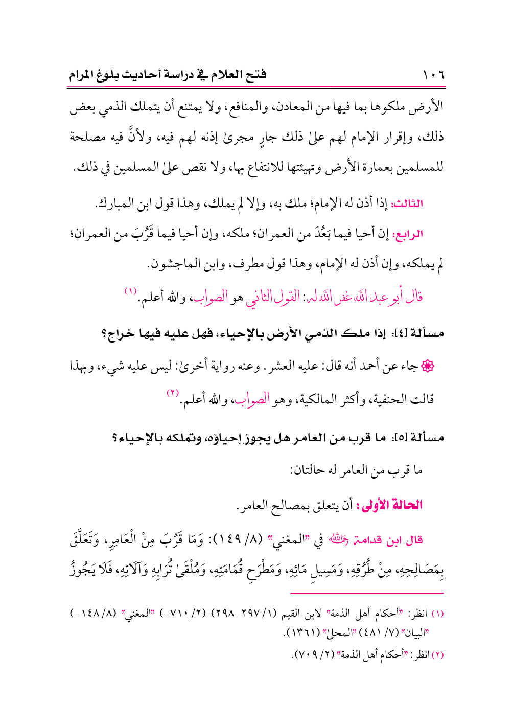 مسألة [٥]: ما قرب من العامر هل يجوز إحياؤه، وتملكه بالإحياء؟
