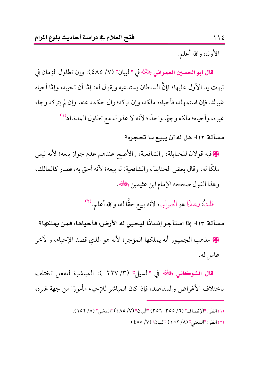 قال الشوكاني -رحمه الله- في «السيل» (٣/ ٢٢٧ - ): المباشرة للفعل تختلف باختلاف الأغراض والمقاصد، فإذا كان المباشر للإحياء مأمورًا من جهة غيره،
