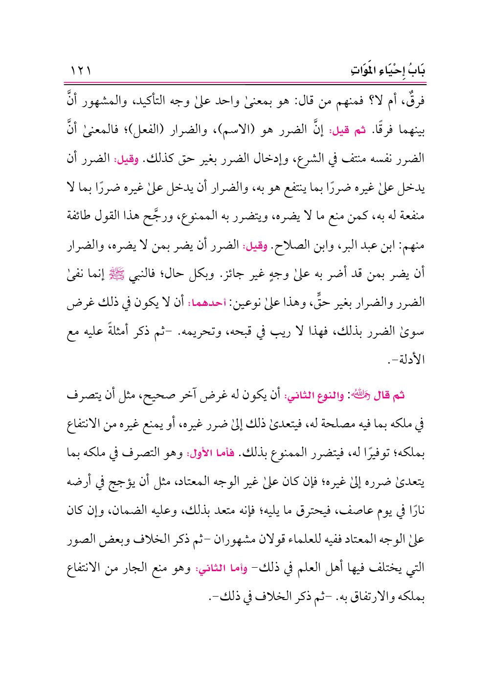 فرقٌ، أم لا؟ فمنهم من قال: هو بمعنى واحد على وجه التأكيد، والمشهور أنَّ بينهما فرقًا. ثم قيل: إنَّ الضرر هو (الاسم)، والضرار (الفعل)؛ فالمعنى أنَّ الضرر نفسه منتف في الشرع، وإدخال الضرر بغير حق كذلك. وقيل: الضرر أن يدخل على غيره ضررًا بما ينتفع هو به، والضرار أن يدخل على غيره ضررًا بما لا منفعة له به، كمن منع ما لا يضره، ويتضرر به الممنوع، ورجَّح هذا القول طائفة منهم: ابن عبد البر، وابن الصلاح. وقيل: الضرر أن يضر بمن لا يضره، والضرار أن يضر بمن قد أضر به على وجهٍ غير جائز. وبكل حال؛ فالنبي - صلى الله عليه وسلم - إنما نفى الضرر والضرار بغير حقٍّ، وهذا على نوعين: أحدهما: أن لا يكون في ذلك غرض سوى الضرر بذلك، فهذا لا ريب في قبحه، وتحريمه. -ثم ذكر أمثلةً عليه مع الأدلة-.
