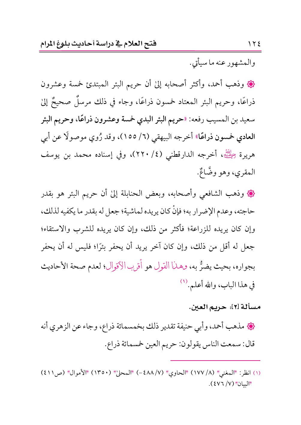 • وذهب أحمد، وأكثر أصحابه إلى أن حريم البئر المبتدئ خمسة وعشرون ذراعًا، وحريم البئر المعتاد خمسون ذراعًا، وجاء في ذلك مرسلٌ صحيحٌ إلى سعيد بن المسيب رفعه: «حريم البئر البدي خمسة وعشرون ذراعًا، وحريم البئر العادي خمسون ذراعًا» أخرجه البيهقي (٦/ ١٥٥)، وقد رُوي موصولًا عن أبي هريرة -رضي الله عنه-، أخرجه الدارقطني (٤/ ٢٢٠)، وفي إسناده محمد بن يوسف المقري، وهو وضَّاعٌ.