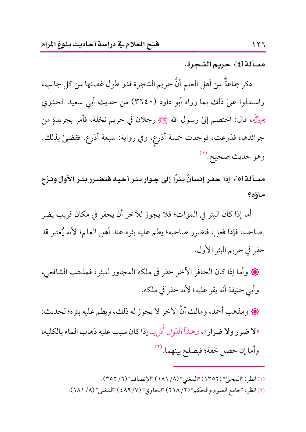 ذكر جماعةٌ من أهل العلم أنَّ حريم الشجرة قدر طول غصنها من كل جانب، واستدلوا على ذلك بما رواه أبو داود (٣٦٤٠) من حديث أبي سعيد الخدري -رضي الله عنه-، قال: اختصم إلى رسول الله - صلى الله عليه وسلم - رجلان في حريم نخلة، فأمر بجريدةٍ من جرائدها، فذرعت، فوجدت خمسة أذرعٍ، وفي رواية: سبعة أذرع. فقضى بذلك. وهو حديث صحيح. (¬١)