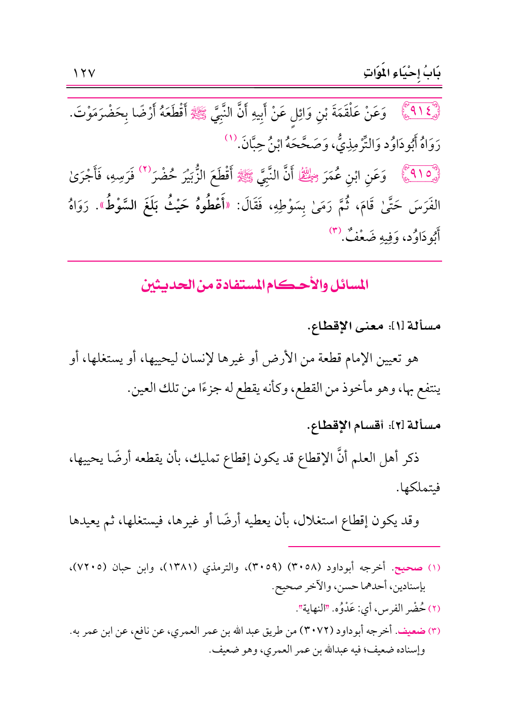 ٩١٤ - وَعَنْ عَلْقَمَةَ بْنِ وَائِلٍ عَنْ أَبِيهِ أَنَّ النَّبِيَّ - صلى الله عليه وسلم - أَقْطَعَهُ أَرْضًا بِحَضْرَمَوْتَ. رَوَاهُ أَبُودَاوُد وَالتِّرْمِذِيُّ، وَصَحَّحَهُ ابْنُ حِبَّانَ. (¬١)
