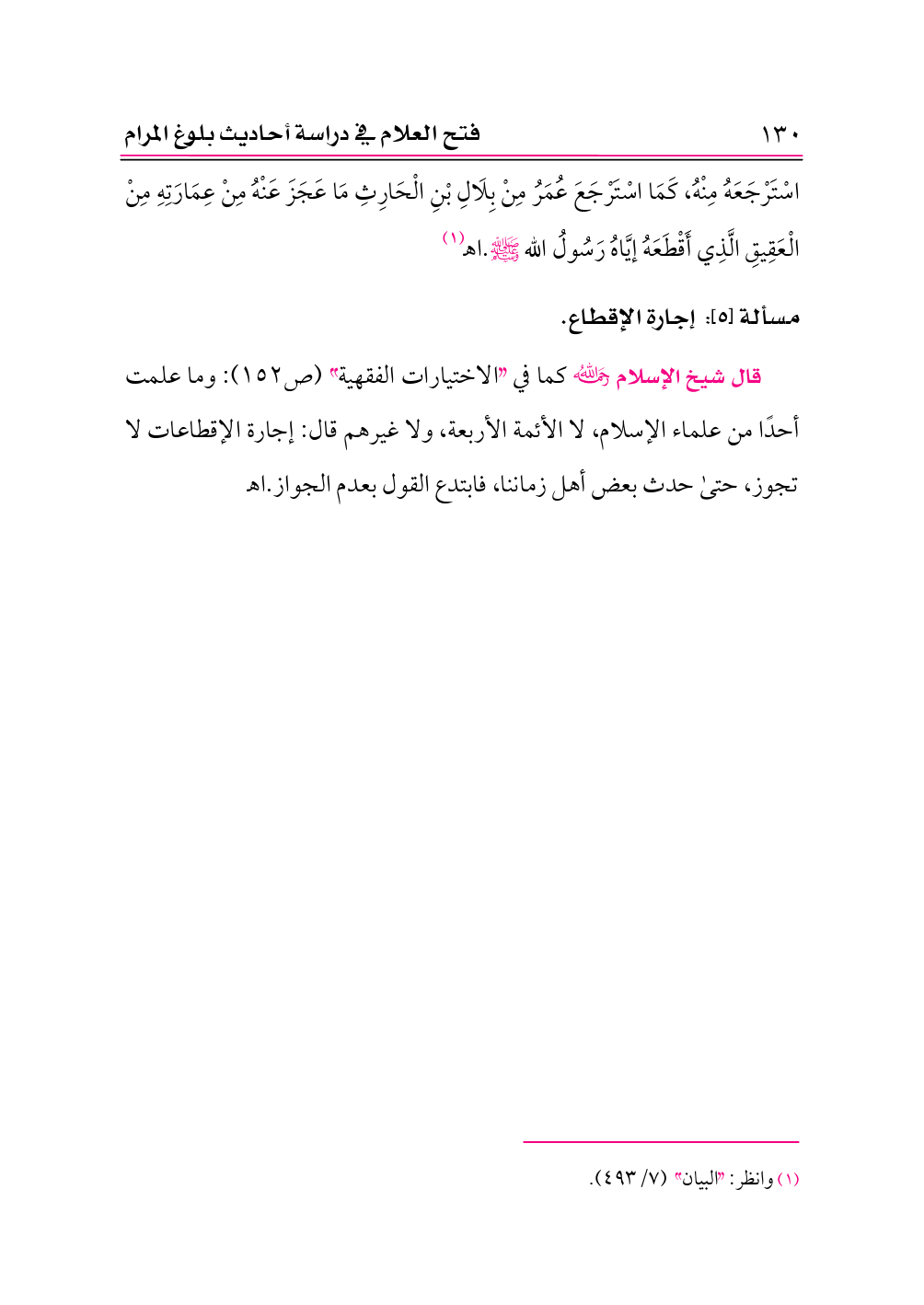 قال شيخ الإسلام -رحمه الله- كما في «الاختيارات الفقهية» (ص ١٥٢): وما علمت أحدًا من علماء الإسلام، لا الأئمة الأربعة، ولا غيرهم قال: إجارة الإقطاعات لا تجوز، حتى حدث بعض أهل زماننا، فابتدع القول بعدم الجواز. اهـ