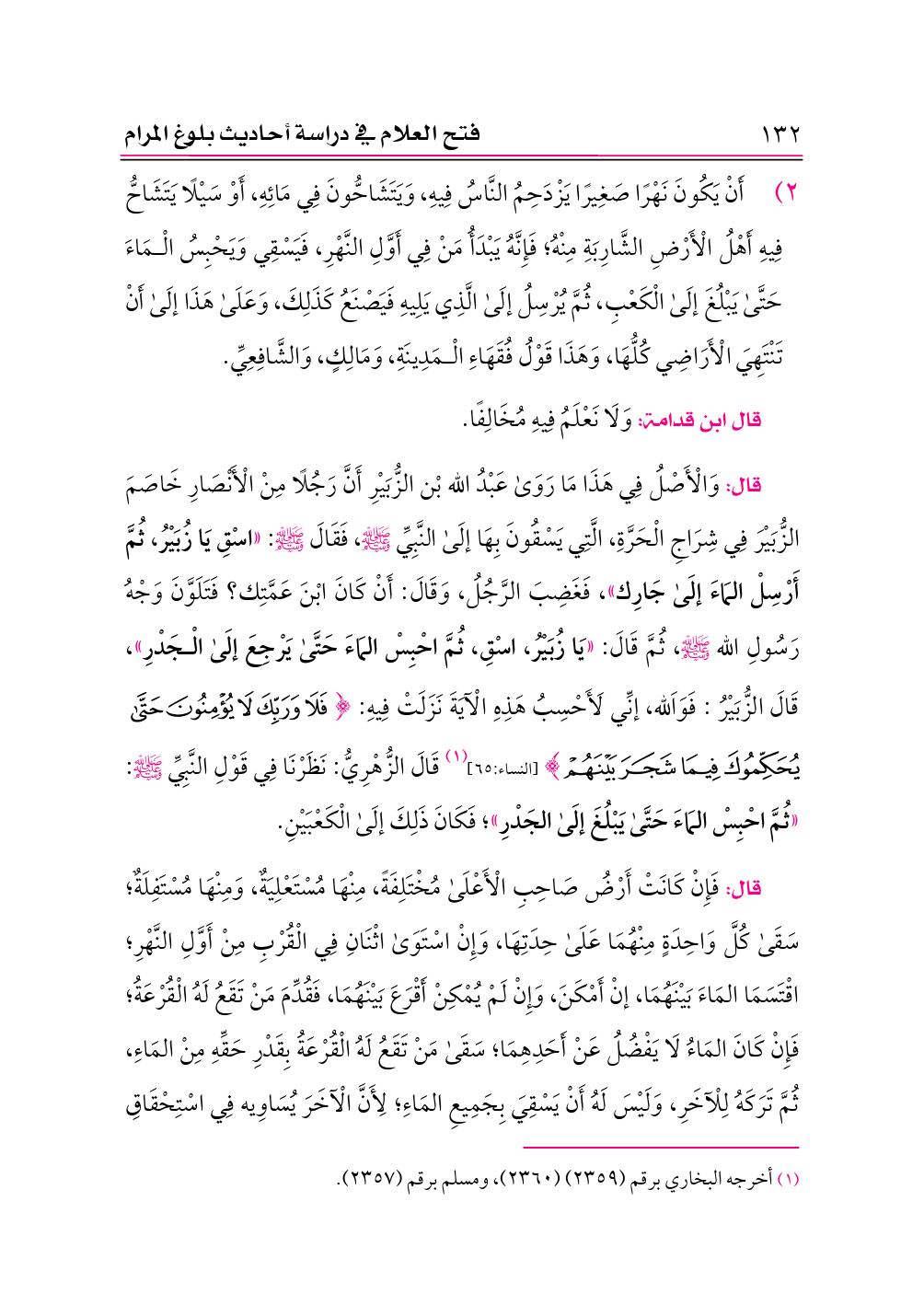 قال: وَالْأَصْلُ فِي هَذَا مَا رَوَى عَبْدُ الله بْن الزُّبَيْرِ أَنَّ رَجُلًا مِنْ الْأَنْصَارِ خَاصَمَ الزُّبَيْرَ فِي شِرَاجِ الْحَرَّةِ، الَّتِي يَسْقُونَ بِهَا إلَى النَّبِيِّ - صلى الله عليه وسلم -، فَقَالَ - صلى الله عليه وسلم -: «اسْقِ يَا زُبَيْرُ، ثُمَّ أَرْسِلْ المَاءَ إلَى جَارِك»، فَغَضِبَ الرَّجُلُ، وَقَالَ: أَنْ كَانَ ابْنَ عَمَّتِك؟ فَتَلَوَّنَ وَجْهُ رَسُولِ الله - صلى الله عليه وسلم -، ثُمَّ قَالَ: «يَا زُبَيْرُ، اسْقِ، ثُمَّ احْبِسْ المَاءَ حَتَّى يَرْجِعَ إلَى الْجَدْرِ»، قَالَ الزُّبَيْرُ: فَوَاَلله، إنِّي لَأَحْسِبُ هَذِهِ الْآيَةَ نَزَلَتْ فِيهِ: {فَلَا وَرَبِّكَ لَا يُؤْمِنُونَ حَتَّى يُحَكِّمُوكَ فِيمَا شَجَرَ بَيْنَهُمْ} [النساء:٦٥] (¬١) قَالَ الزُّهْرِيُّ: نَظَرْنَا فِي قَوْلِ النَّبِيِّ - صلى الله عليه وسلم -: «ثُمَّ احْبِسْ المَاءَ حَتَّى يَبْلُغَ إلَى الجَدْرِ»؛ فَكَانَ ذَلِكَ إلَى الْكَعْبَيْنِ.