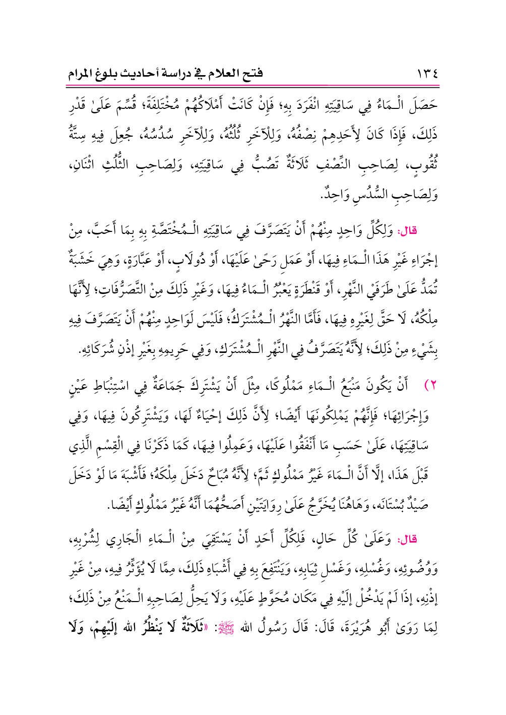 قال: وَعَلَى كُلِّ حَالٍ، فَلِكُلِّ أَحَدٍ أَنْ يَسْتَقِيَ مِنْ الْمَاءِ الْجَارِي لِشُرْبِهِ، وَوُضُوئِهِ، وَغُسْلِهِ، وَغَسْلِ ثِيَابِهِ، وَيَنْتَفِعَ بِهِ فِي أَشْبَاهِ ذَلِكَ، مِمَّا لَا يُؤَثِّرُ فِيهِ، مِنْ غَيْرِ إذْنِهِ، إذَا لَمْ يَدْخُلْ إلَيْهِ فِي مَكَان مُحَوَّطٍ عَلَيْهِ، وَلَا يَحِلُّ لِصَاحِبِهِ الْمَنْعُ مِنْ ذَلِكَ؛ لِمَا رَوَى أَبُو هُرَيْرَةَ، قَالَ: قَالَ رَسُولُ الله - صلى الله عليه وسلم -: «ثَلَاثَةٌ لَا يَنْظُرُ الله إلَيْهِمْ، وَلَا
