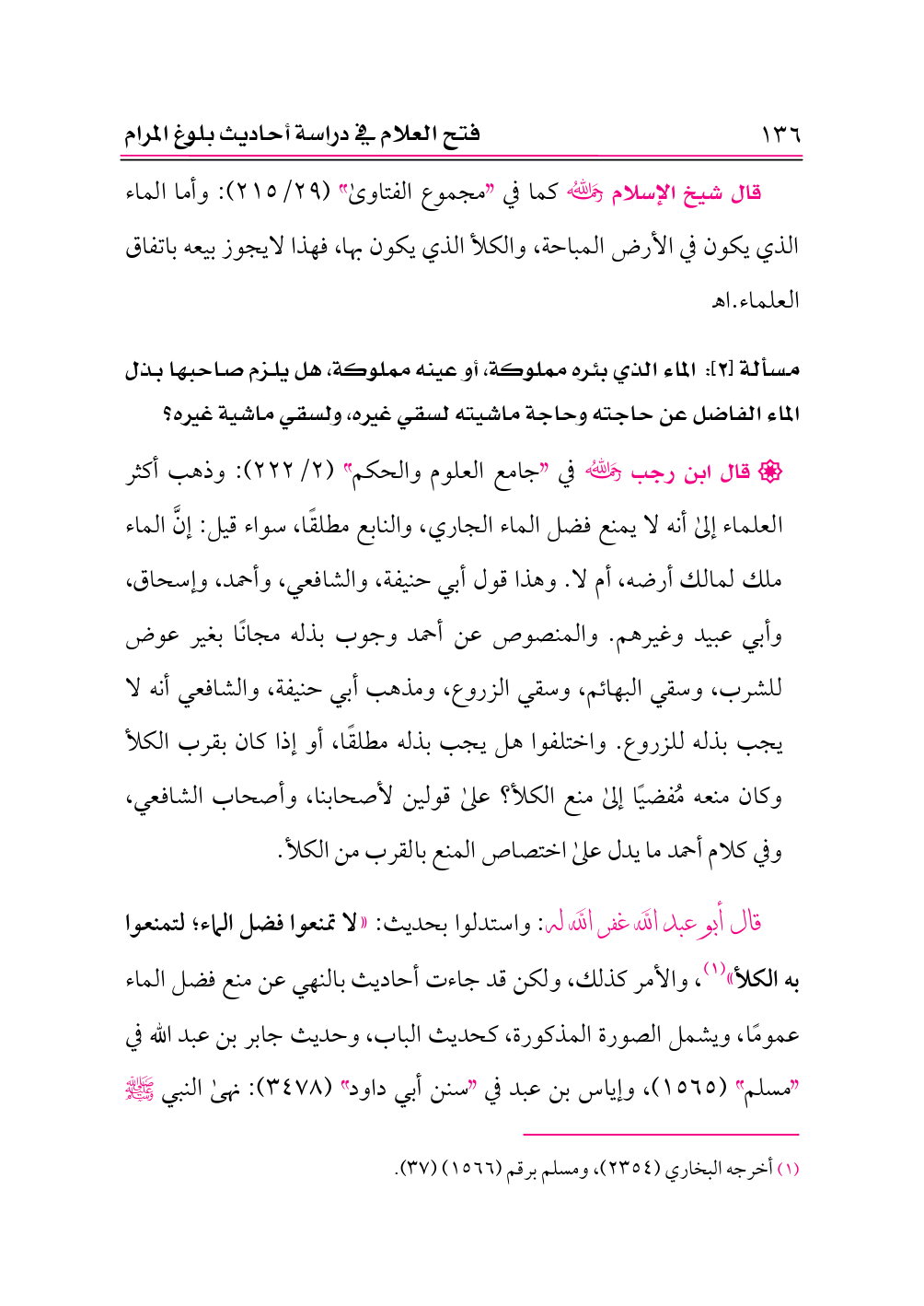 • قال ابن رجب -رحمه الله- في «جامع العلوم والحكم» (٢/ ٢٢٢): وذهب أكثر العلماء إلى أنه لا يمنع فضل الماء الجاري، والنابع مطلقًا، سواء قيل: إنَّ الماء ملك لمالك أرضه، أم لا. وهذا قول أبي حنيفة، والشافعي، وأحمد، وإسحاق، وأبي عبيد وغيرهم. والمنصوص عن أحمد وجوب بذله مجانًا بغير عوض للشرب، وسقي البهائم، وسقي الزروع، ومذهب أبي حنيفة، والشافعي أنه لا يجب بذله للزروع. واختلفوا هل يجب بذله مطلقًا، أو إذا كان بقرب الكلأ وكان منعه مُفضيًا إلى منع الكلأ؟ على قولين لأصحابنا، وأصحاب الشافعي، وفي كلام أحمد ما يدل على اختصاص المنع بالقرب من الكلأ.
