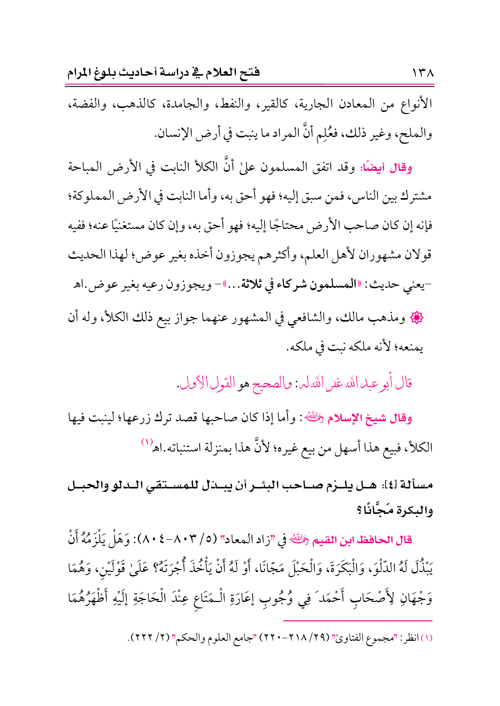 وقال أيضًا: وقد اتفق المسلمون على أنَّ الكلأ النابت في الأرض المباحة مشترك بين الناس، فمن سبق إليه؛ فهو أحق به، وأما النابت في الأرض المملوكة؛ فإنه إن كان صاحب الأرض محتاجًا إليه؛ فهو أحق به، وإن كان مستغنيًا عنه؛ ففيه قولان مشهوران لأهل العلم، وأكثرهم يجوزون أخذه بغير عوض؛ لهذا الحديث -يعني حديث: «المسلمون شركاء في ثلاثة ... » - ويجوزون رعيه بغير عوض. اهـ