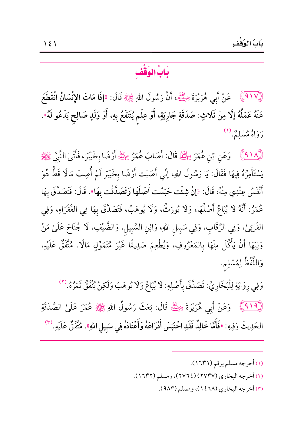 ٩١٧ - عَنْ أَبِي هُرَيْرَةَ -رضي الله عنه-، أَنَّ رَسُولَ اللهِ - صلى الله عليه وسلم - قَالَ: «إذَا مَاتَ الإِنْسَانُ انْقَطَعَ عَنْهُ عَمَلُهُ إلَّا مِنْ ثَلَاثٍ: صَدَقَةٍ جَارِيَةٍ، أَوْ عِلْمٍ يُنْتَفَعُ بِهِ، أَوْ وَلَدٍ صَالِحٍ يَدْعُو لَهُ». رَوَاهُ مُسْلِمٌ. (¬١)