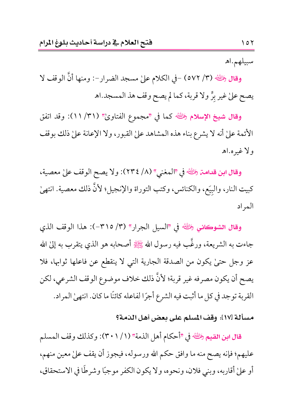 وقال -رحمه الله- (٣/ ٥٧٢) -في الكلام على مسجد الضرار-: ومنها أنَّ الوقف لا يصح على غير بِرٍّ ولا قربة، كما لم يصح وقف هذ المسجد. اهـ